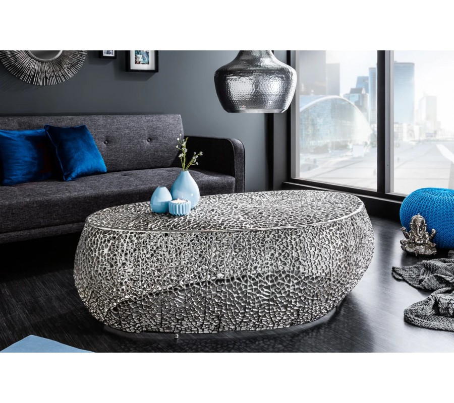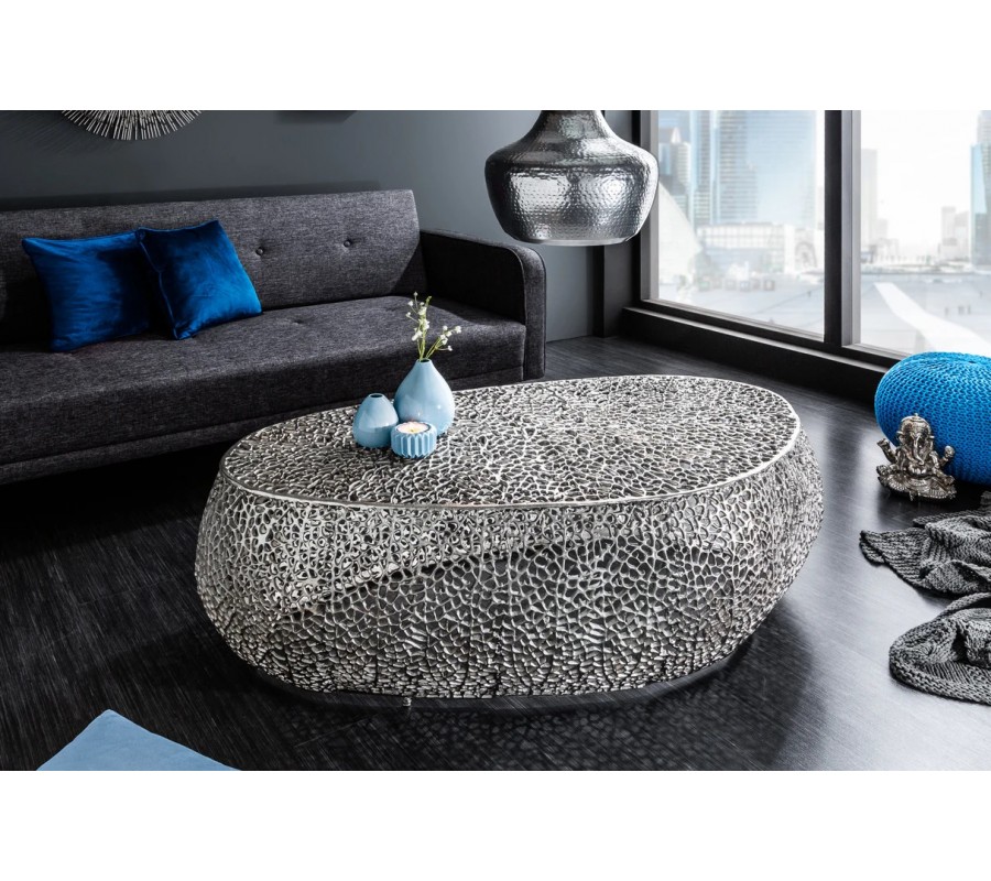 Konferenčný stolík Hoja bude štýlovým stredobodom vašej obývačky. Jeho organický tvar pôsobí elegantným moderným dojmom, zatiaľ čo prevedenie v striebornej farbe prináša do kompozície luxusný glamour prvok.