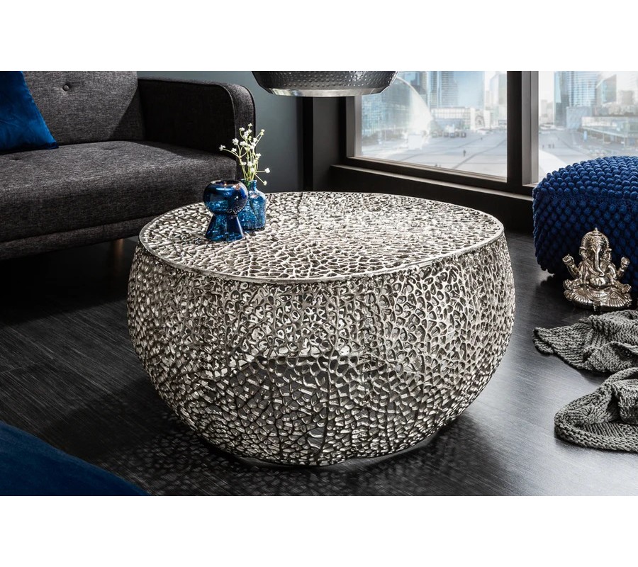 Moderný dizajnový okrúhly konferenčný stolík Hoja v striebornej farbe s organickým vzorom z kovu 80 cm