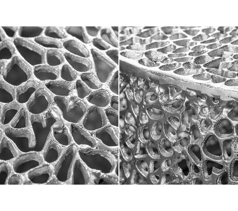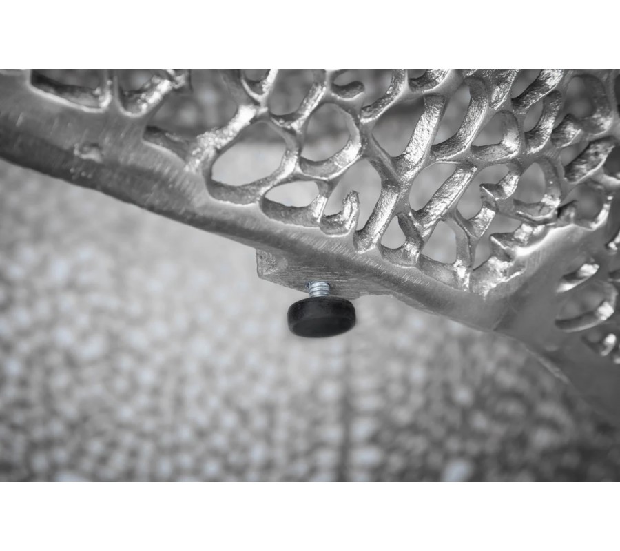 Konferenčný stolík je ručne vyrobený z kovovej zliatiny, čo zaručuje veľkú pozornosť k detailom a originálne prevedenie každého kusu. Strieborná farba je mierne zmatnená a v kombinácii so vzdušným dizajnom robí z tohto nábytku šperk vašej obývačky.