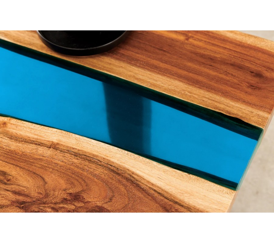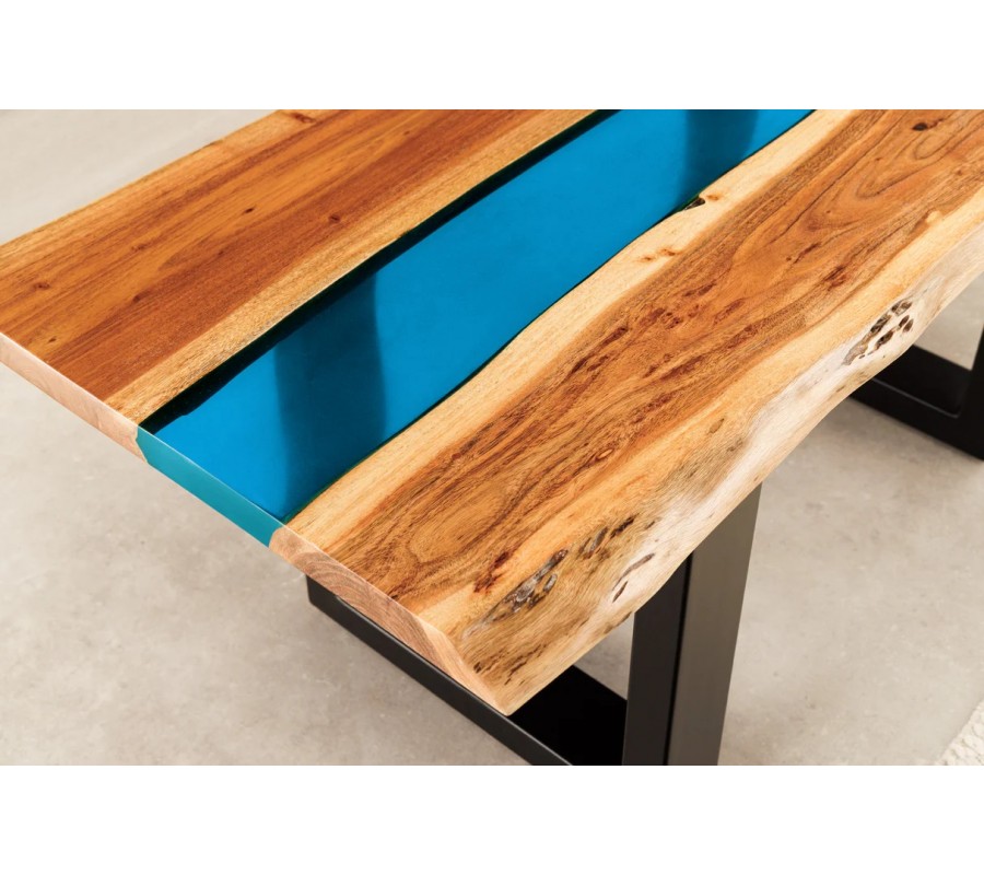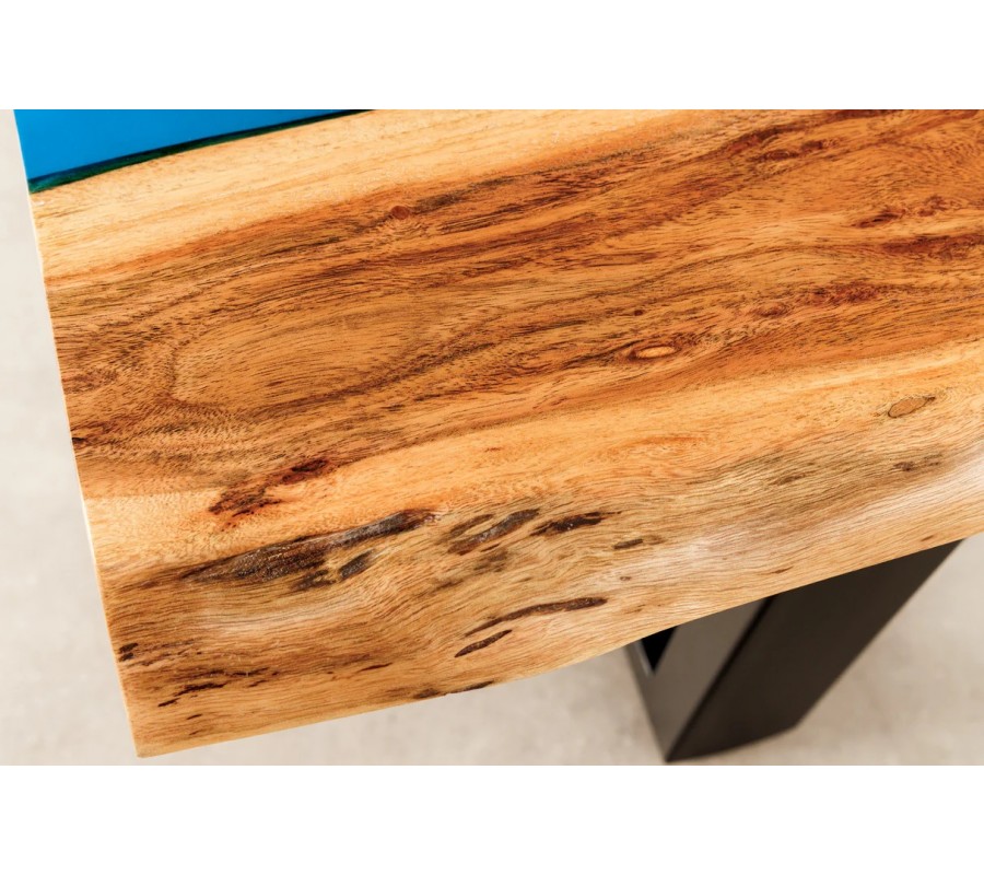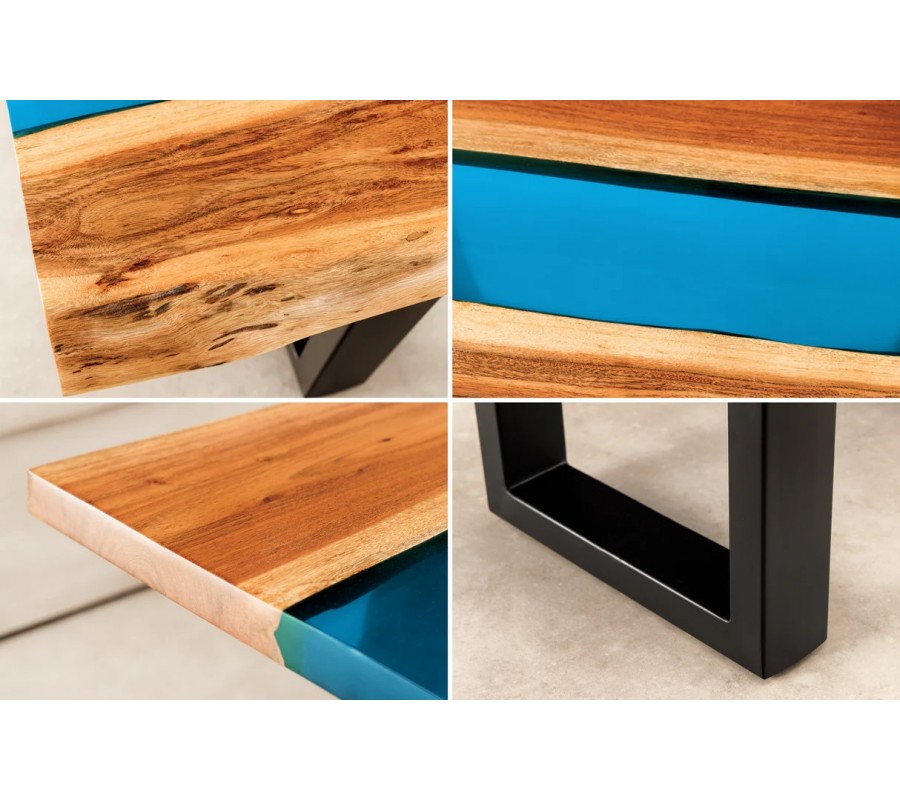 Na prvý pohľad vás upúta unikátna obdĺžniková vrchná doska. Tvoria ju dve dosky z masívneho akáciového dreva s organicky tvarovanými pozdĺžnymi hranami. Teplú medovú hnedú farbu dopĺňajú kontrastné tmavšie a svetlejšie odtiene vo výraznej naturálnej kresbe dreva. V strede sú dosky spojené čiastočne priehľadným pásom z epoxidovej živice v jasnom modrom odtieni. Vytvára živý kontrast k prírodnému drevu a dodáva nábytku dekoratívny prvok.