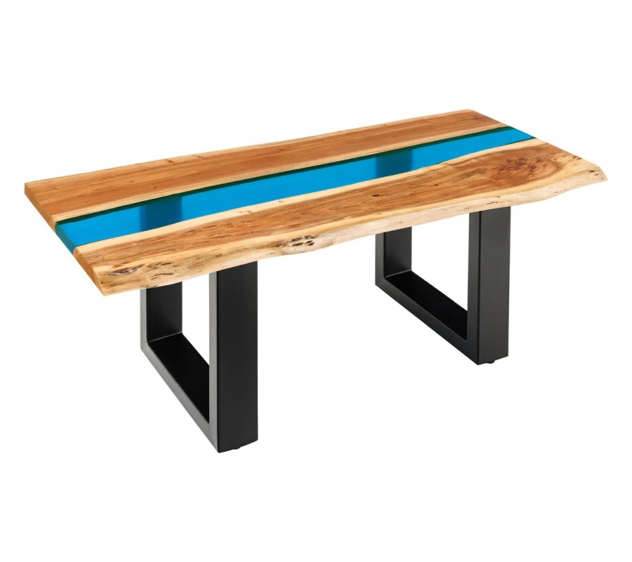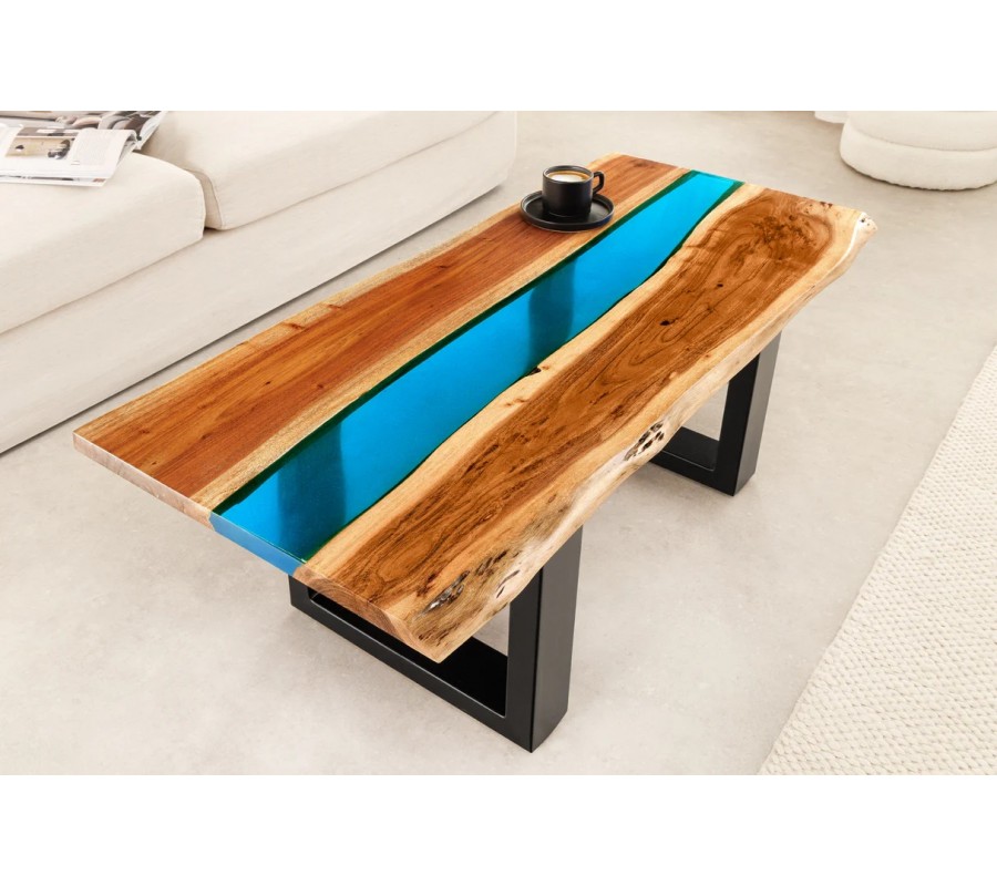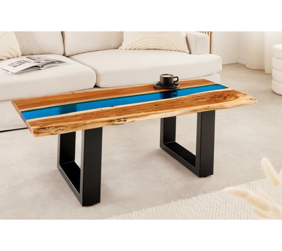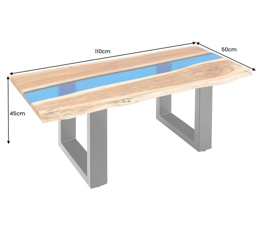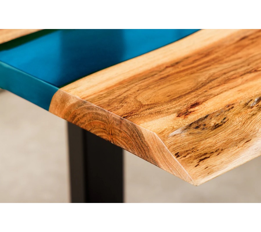 Na prvý pohľad vás upúta unikátna obdĺžniková vrchná doska. Tvoria ju dve dosky z masívneho akáciového dreva s organicky tvarovanými pozdĺžnymi hranami. Teplú medovú hnedú farbu dopĺňajú kontrastné tmavšie a svetlejšie odtiene vo výraznej naturálnej kresbe dreva. V strede sú dosky spojené čiastočne priehľadným pásom z epoxidovej živice v jasnom modrom odtieni. Vytvára živý kontrast k prírodnému drevu a dodáva nábytku dekoratívny prvok.