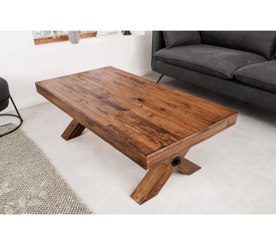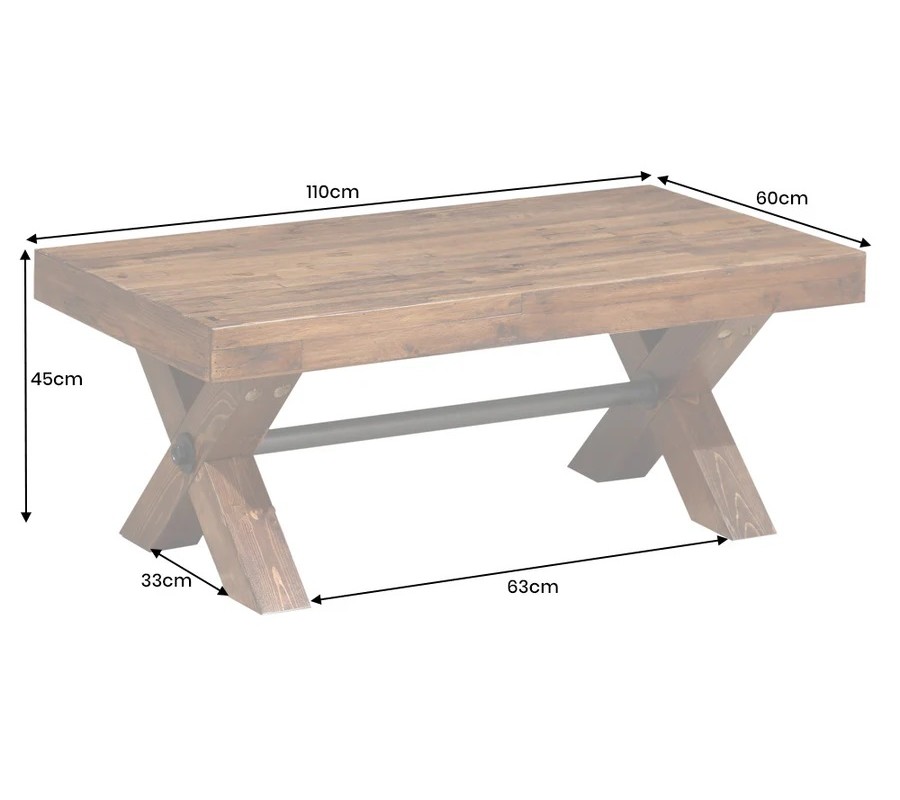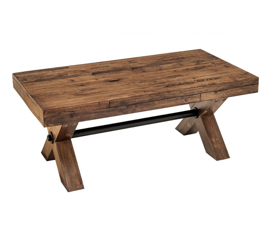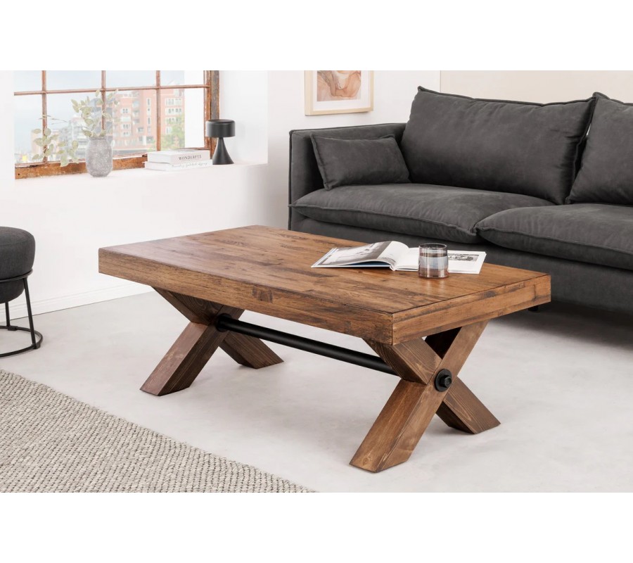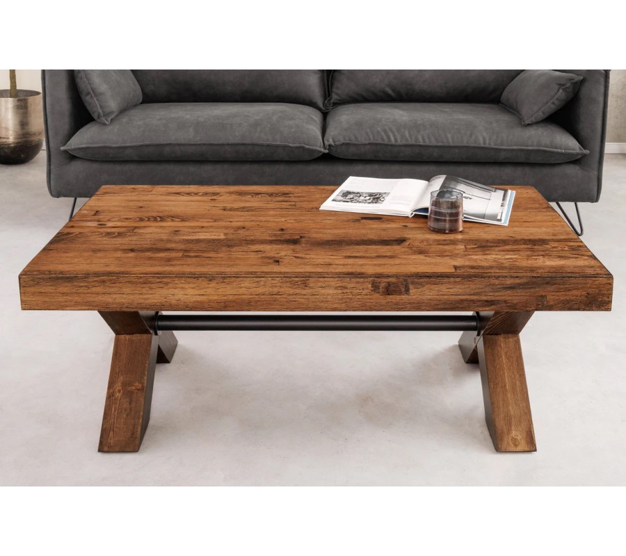 Dizajnový vidiecky obdĺžnikový konferenčný stolík Sawyer s prekríženými nohami s hnedou rustikálnou povrchovou úpravou 110 cm