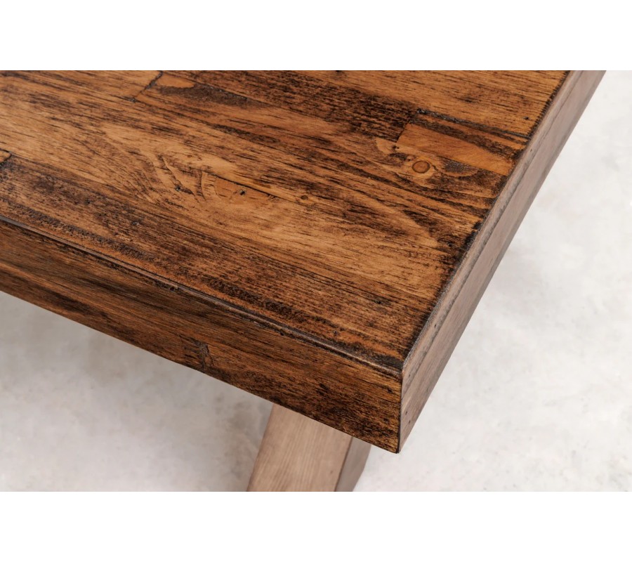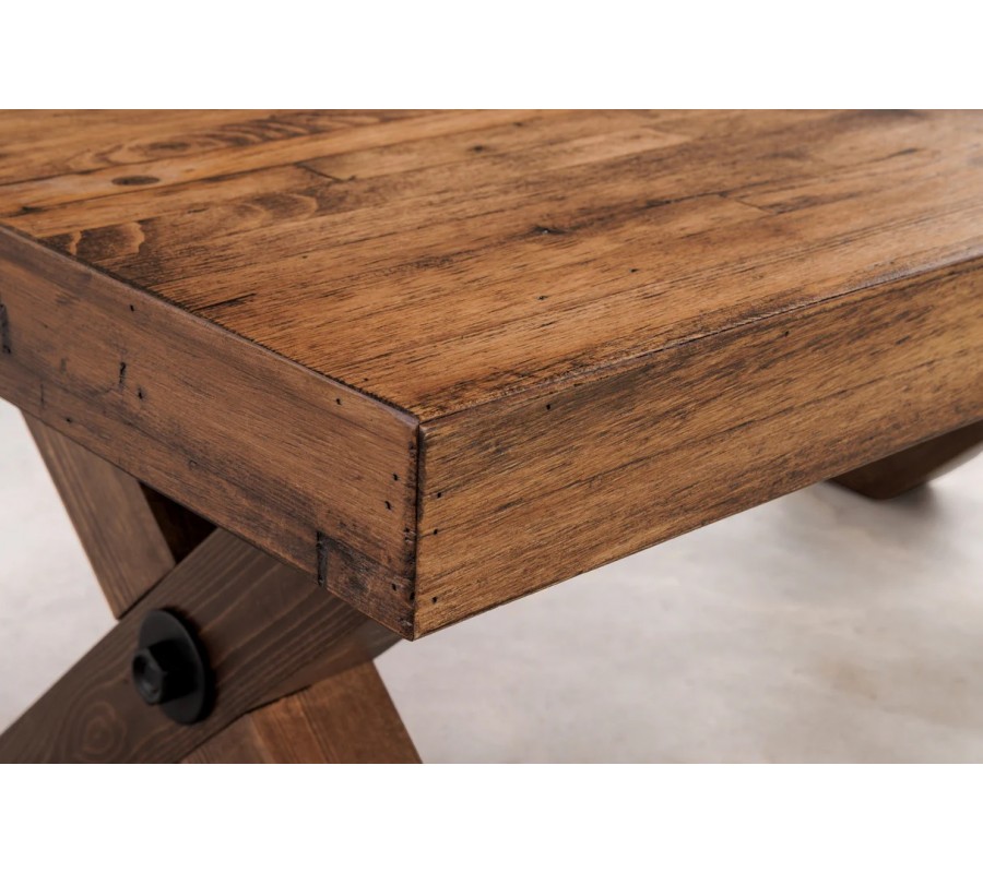 Stolík má obdĺžnikovú vrchnú dosku, ktorá je na kratších stranách podopretá dvomi nožičkami v tvare X. Je vyrobený z kombinácie masívneho a dyhovaného dreva v tmavej hnedej farbe. Povrchová úprava v rustikálnom štýle zvýrazňuje prirodzené štruktúry dreva a tmavé patinovanie dodáva stolíku originálny vintage vizuál.