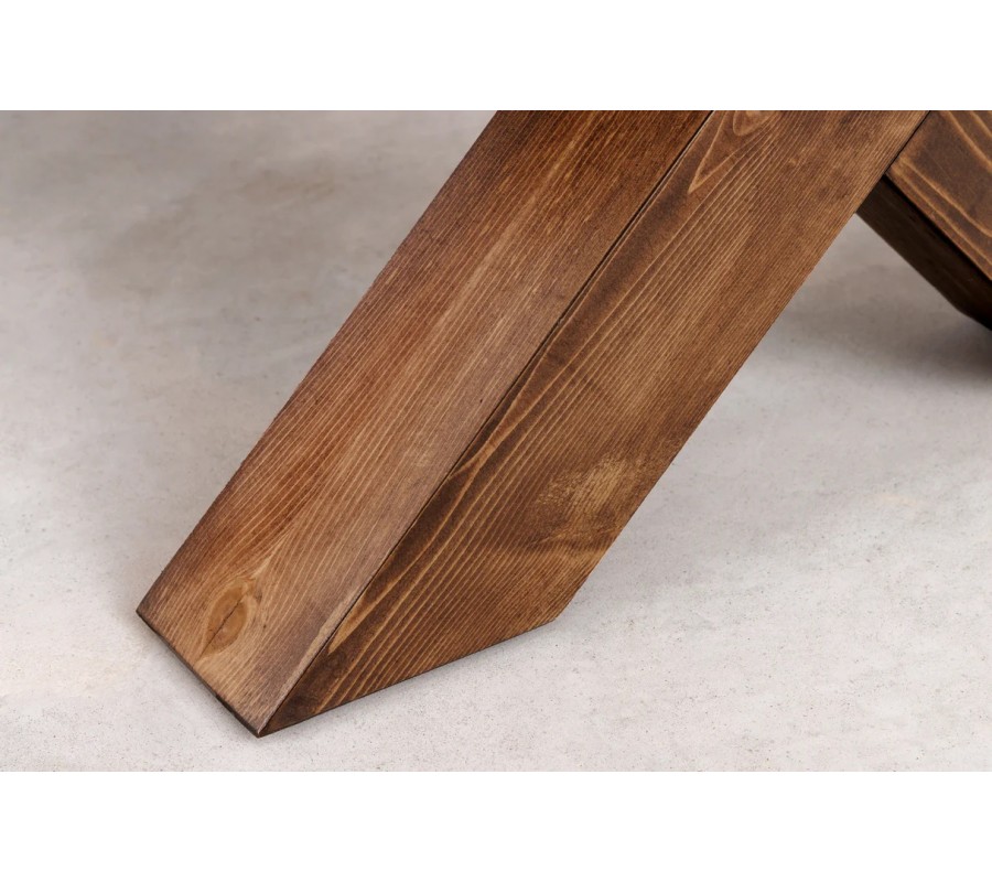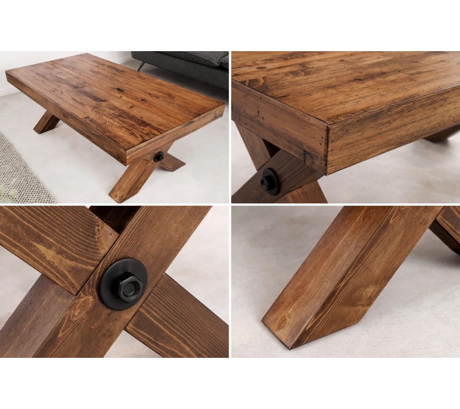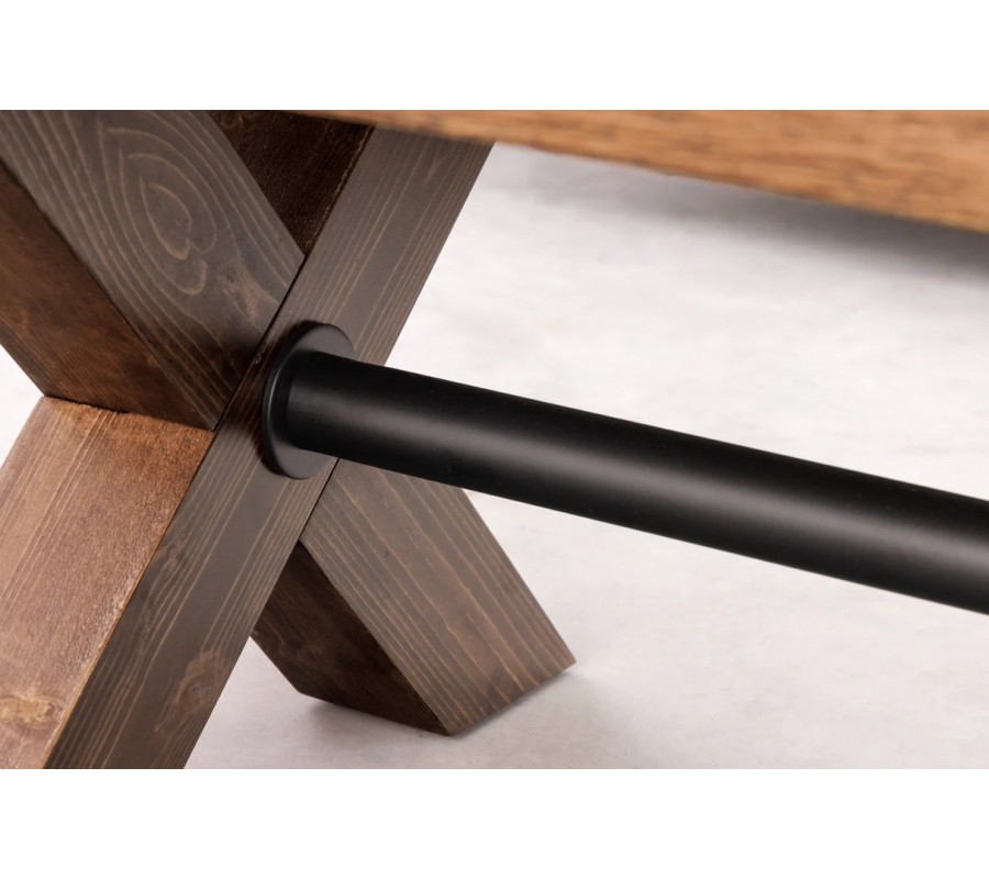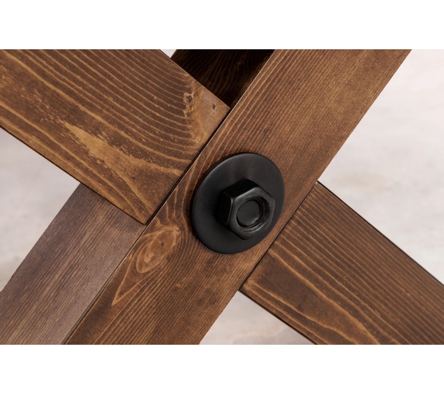 V strede kríženia nožičiek je pomocou výraznej okrúhlej skrutky upevnená lineárna valcovitá spojnica z kovu v čiernej farbe. Priznaný konštrukčný prvok prináša do dizajnu v kombinácii s povrchovou úpravou dreva rustikálne pôsobiaci prvok s nádychom industriálnej estetiky.