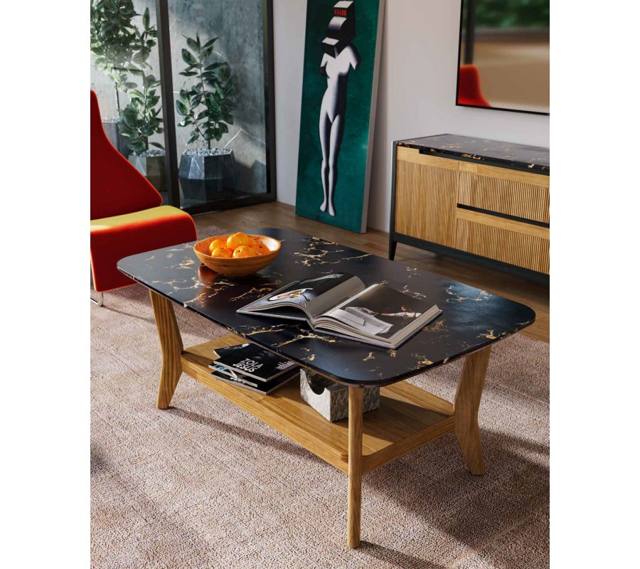 Vrchná doska je vyhotovená v mramorovom dizajne alebo v lakovanom drevenom prevedení, vždy podľa výberu zákazníka. Na výber je viacero typov mramorových dekorov, prípadne možnosť zvoliť čisto drevenú, lakovanú dosku, vďaka čomu sa charakter stolíka dá výrazne prispôsobiť konkrétnemu interiéru. Jemne zaoblené hrany dosky opticky zjemňujú siluetu stolíka a vytvárajú harmonický kontrast k líniám podnožia.