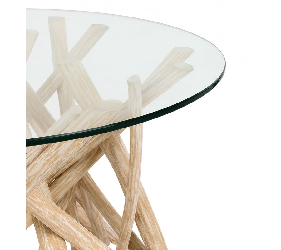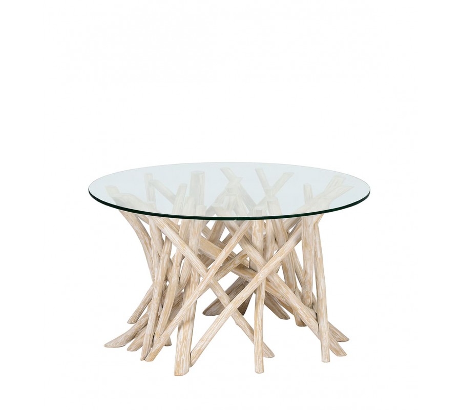 Podstava je vyrobená z bieleného masívneho teakového dreva v elegantnom svetlom krémovom odtieni. Jej nepravidelný dizajn prepletených konárov a vetvičiek pôsobí organicky a pripomína naplavené drevo. Zo stolíka robí nielen funkčný nábytok, ale aj prírodný dekoratívny prvok miestnosti. Teak je zároveň mimoriadne pevný a odolný.