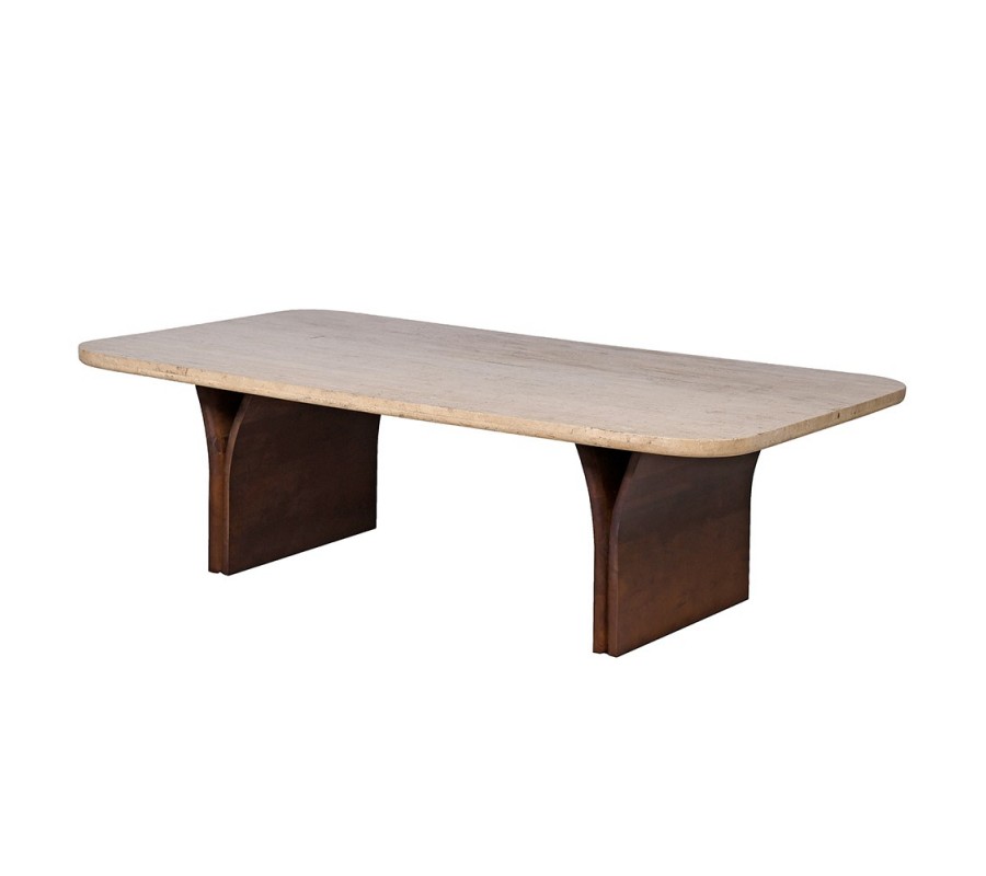 Luxusný dizajnový obdĺžnikový konferenčný stolík Jedy s bronzovými kovovými nožičkami a travertínovou béžovou doskou 137 cm