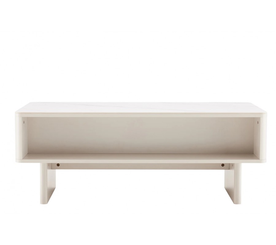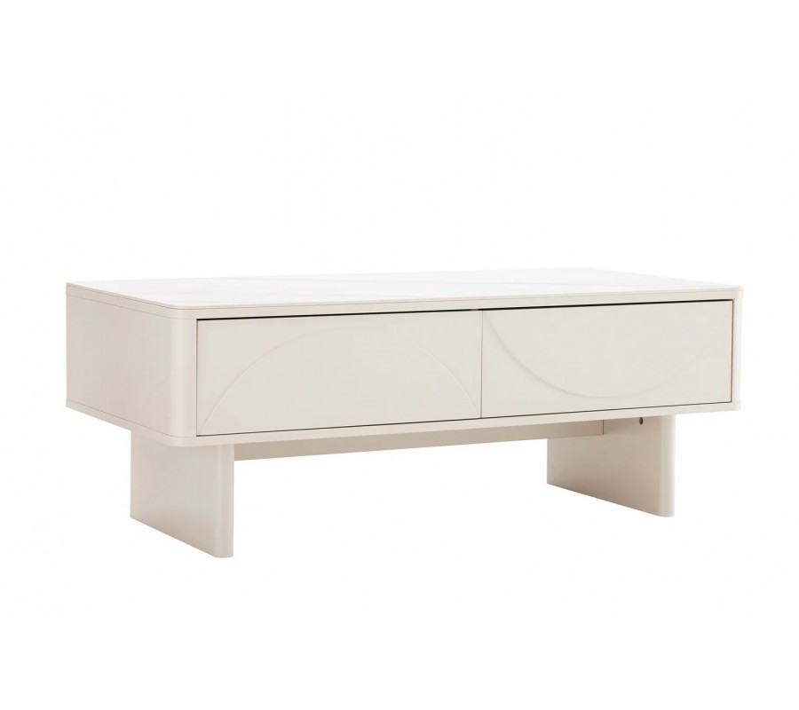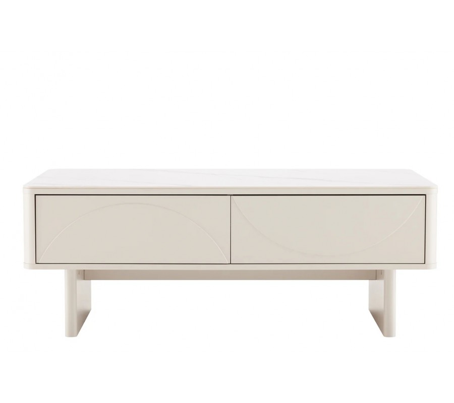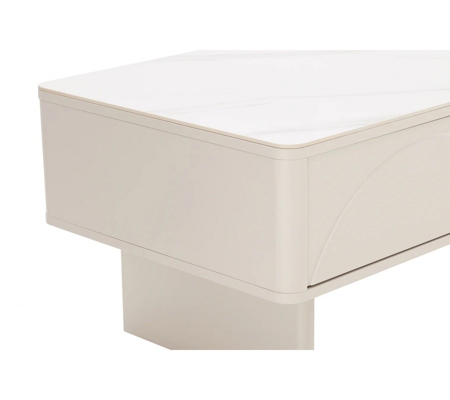 Konferenčný stolík má obdĺžnikovú vrchnú dosku so zaoblenými rohmi. Je vyrobená z keramiky, ktorá poskytuje pevný a odolný povrch. Zdobí ju dizajn bieleho mramoru s jemnými sivými žilkami, ktorá pôsobí exkluzívne a podčiarkuje art deco vizuál. Korpus a podstava stolíka sú vyrobené z kvalitnej dyhy s čistým bielym matným lakovaním.