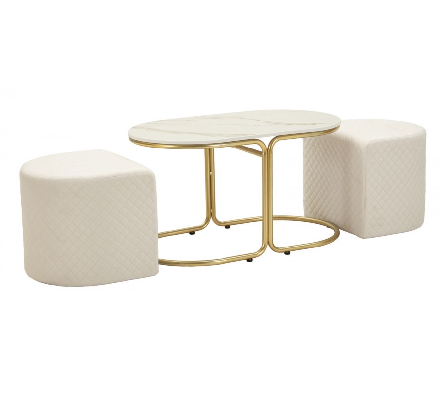 Glamour sada mramorového konferenčného stolíka a dvoch taburetiek Glamia Tapisé s béžovým poťahom a zlatou konštrukciou 79 cm