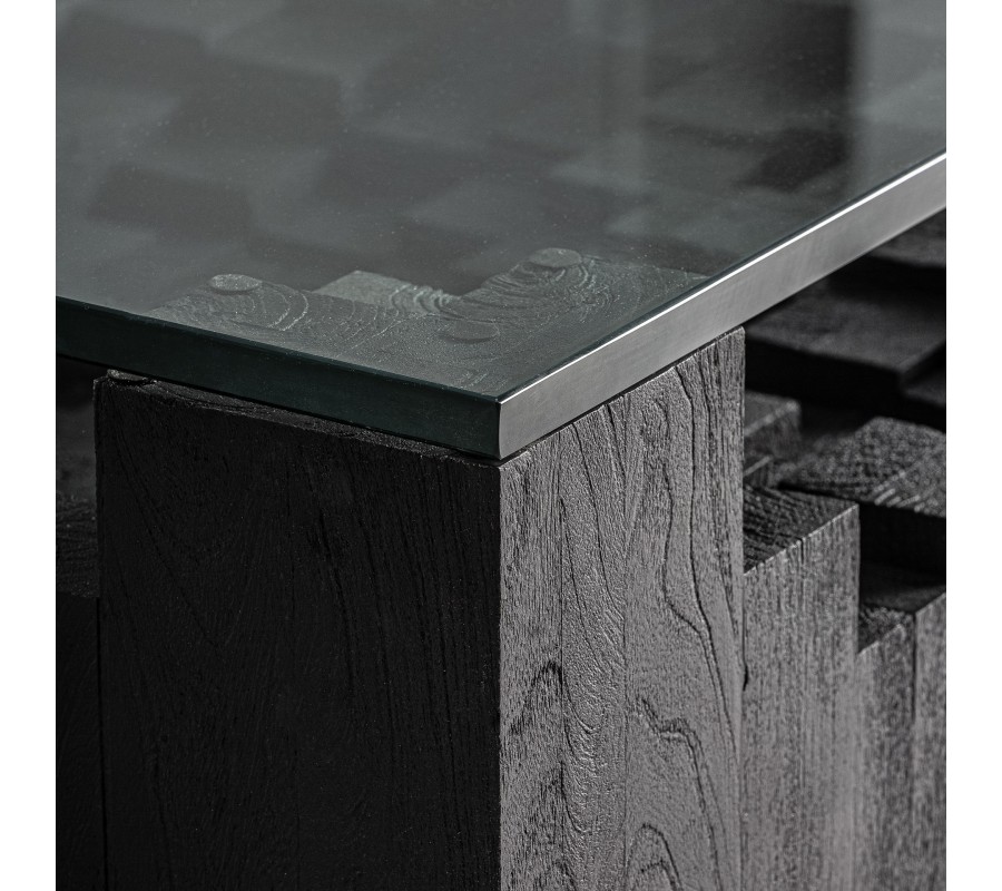 Luxusný art deco masívny geometrický konferenčný stolík Cubia Nera z masívneho mangového dreva v hlbokej čiernej farbe je výrazným dizajnovým solitérom s architektonickým charakterom. Na prvý pohľad pôsobí ako kompaktný blok, no pod transparentnou sklenenou doskou odhaľuje svoju najväčšiu devízu – precízne ručne vyrezávanú podstavu tvorenú hranolmi a kubickými segmentmi rôznych výšok a hĺbok.