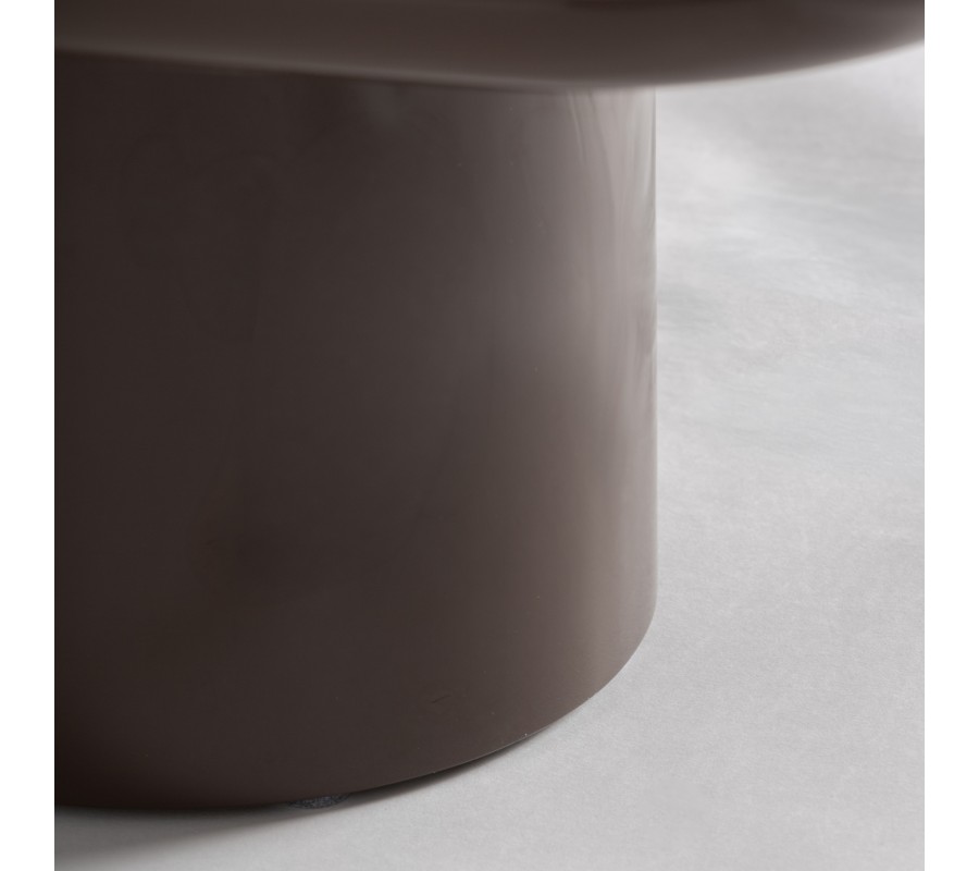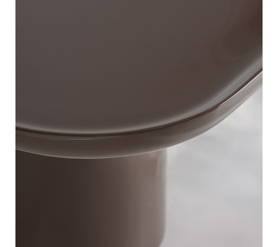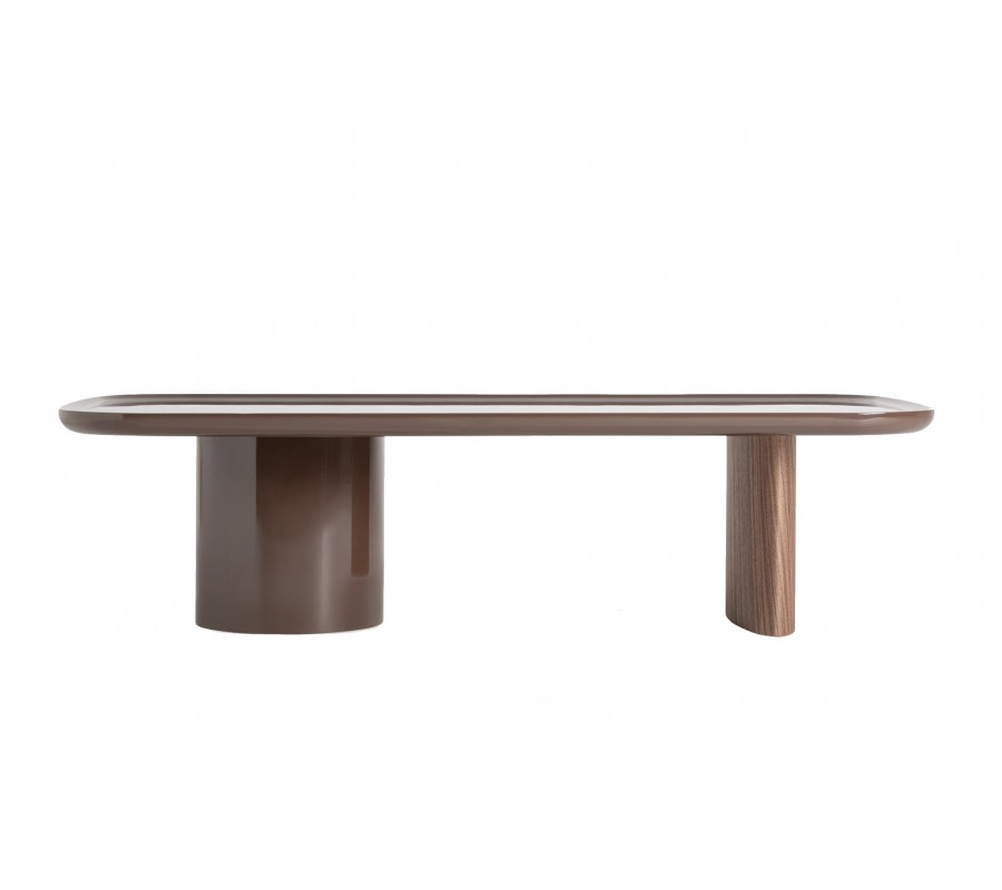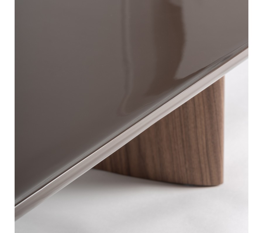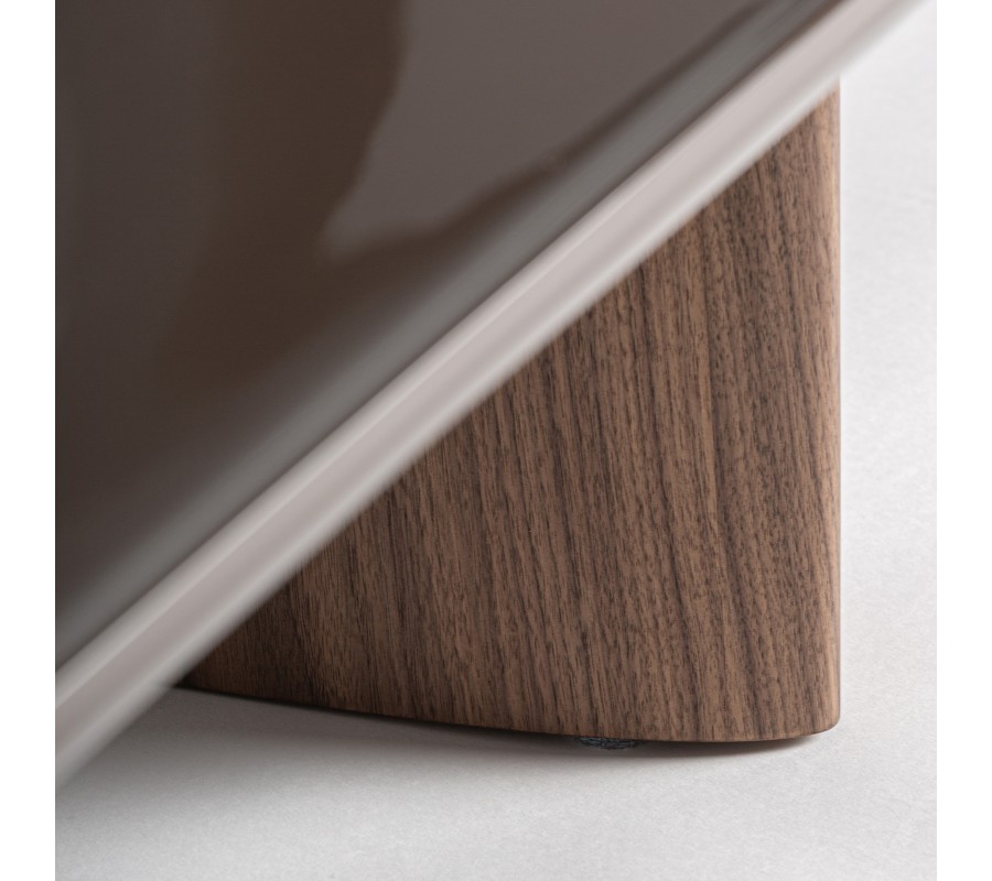 Konštrukciu podopierajú dve výrazovo odlišné nohy, ktoré spolu vytvárajú zaujímavú vizuálnu dynamiku. Jedna noha je okrúhla, s hladkým lesklým hnedým povrchom, ktorý ladí s vrchnou doskou a pôsobí kompaktne a elegantne. Druhá noha má oválny tvar s výraznou drevenou štruktúrou a prirodzenou kresbou dreva, čím do dizajnu vnáša kontrast textúr a jemný architektonický akcent. Spojenie hladkého lesku a prirodzenej drevenej štruktúry vytvára sofistikovanú rovnováhu medzi modernou eleganciou a prirodzeným charakterom materiálu.