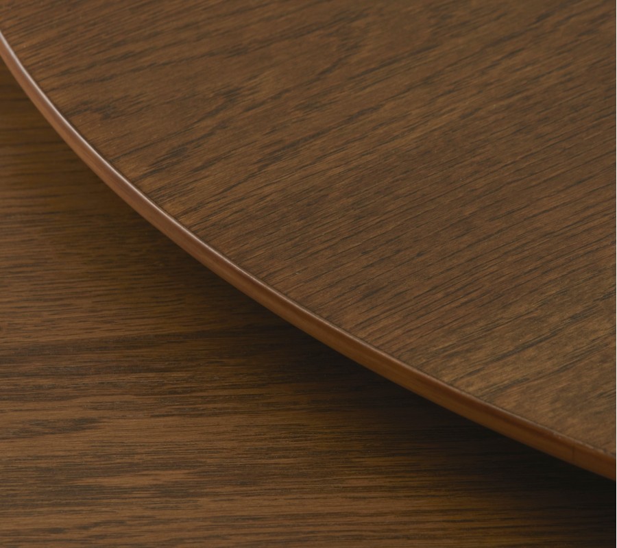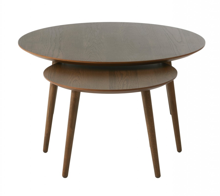 Sada konferenčných stolíkov Karena v tmavohnedom prevedení zaujme čistým moderným dizajnom s výrazným severským charakterom. Jednoduché línie, vyvážené proporcie a prirodzená kresba dreva vytvárajú nadčasový nábytok, ktorý do interiéru prináša eleganciu, funkčnosť a príjemnú prirodzenú atmosféru. Stolíky majú okrúhle dosky z dubovej dyhy v tmavom hnedom odtieni, pričom výrazná štruktúra letokruhov dodáva povrchu hĺbku a autentický drevený charakter.