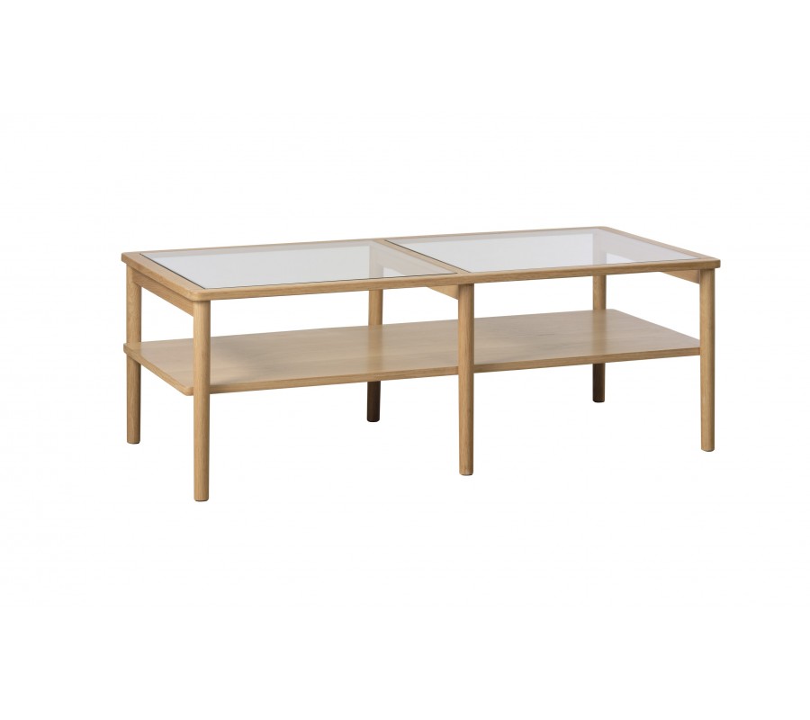 Škandinávsky sklenený obdĺžnikový konferenčný stolík Viggo s priehľadnou doskou a dubovým hnedým rámom s policou 120 cm