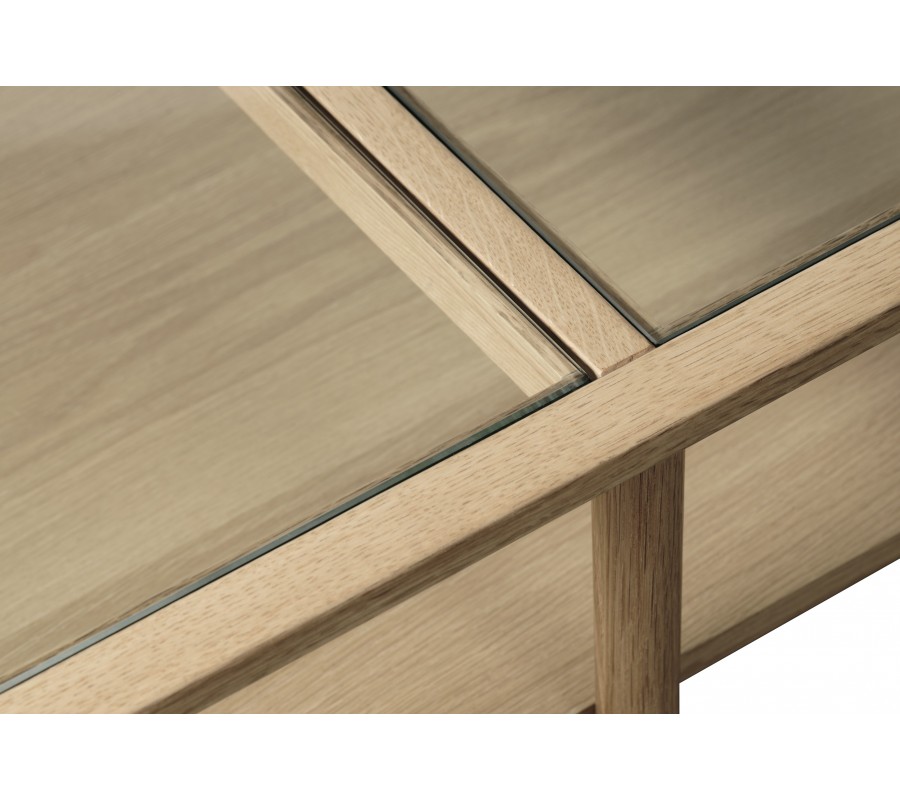 Stolík má obdĺžnikovú vrchnú dosku, ktorej základ tvorí lineárny rám, rozdelený na dve polovice. Na každej strane je osadená priehľadná štvorcová tabuľa z bezpečnostného skla, ktorá poskytne pevný a na údržbu nenáročný povrch.