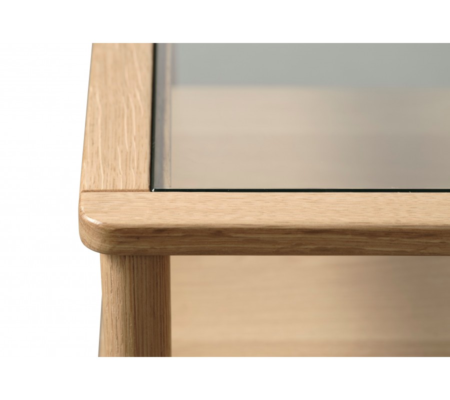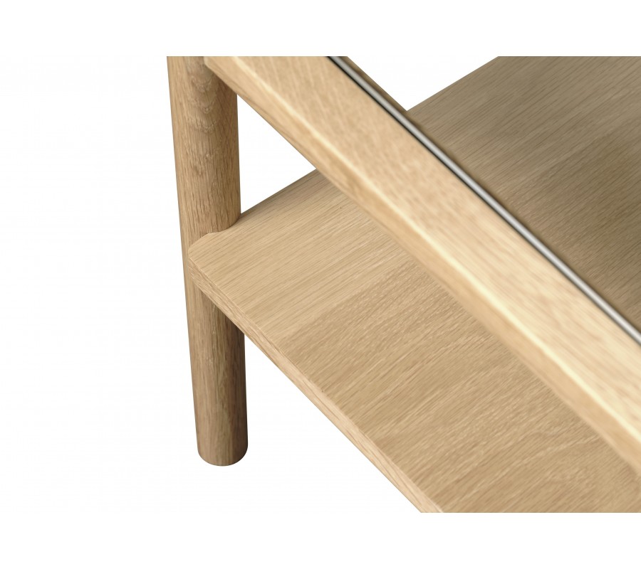 Konštrukcia stolíka je zhotovená z dubovej dyhy, ktorá jej prepožičiava svoju prírodnú svetlú hnedú farbu. Povrchová úprava zachováva viditeľnú pravidelnú kresbu letokruhov, ktorá dodáva nábytku výrazný prírodný charakter.