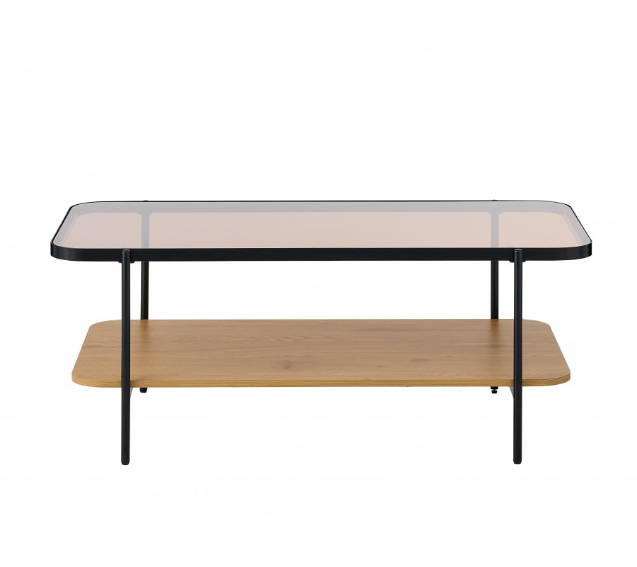 Industriálny obdĺžnikový konferenčný stolík Sonny s hnedou sklenenou doskou a dubovou policou s čiernym rámom 120 cm