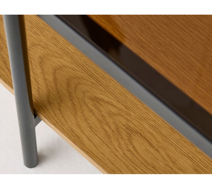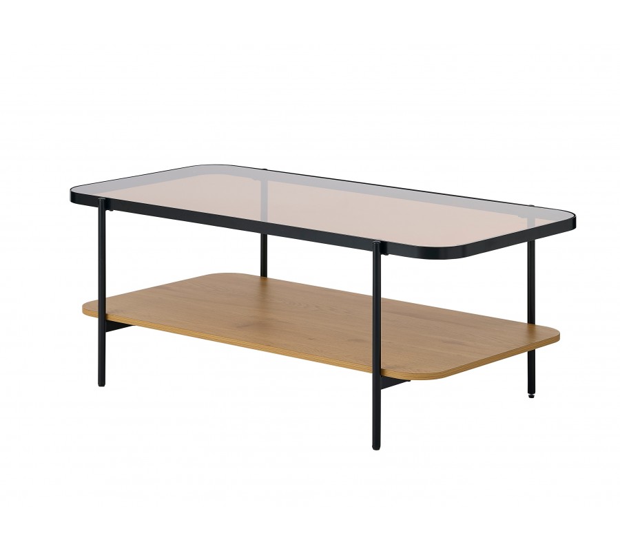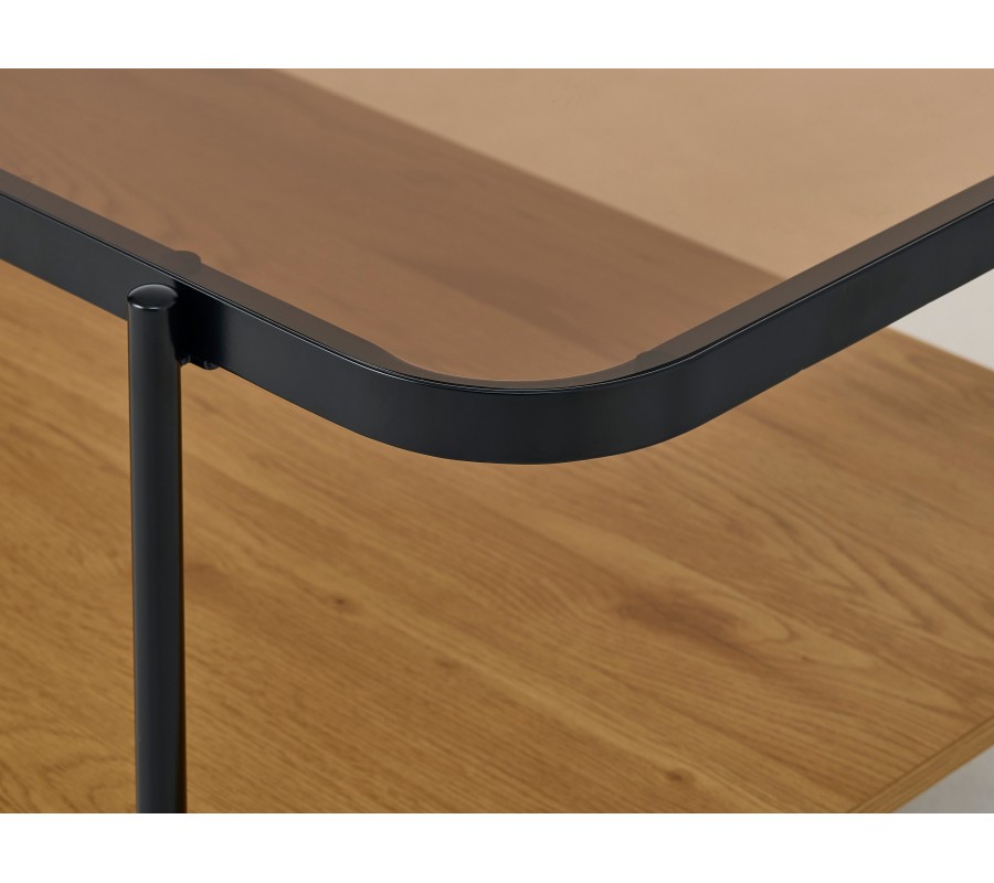 Stolík má obdĺžnikovú vrchnú dosku, vyrobenú z bezpečnostného skla, ktoré zaručuje pevný a na údržbu nenáročný povrch. Je priehľadná a tónovaná do hnedej farby. V spodnej časti ju dopĺňa polica rovnakého tvaru z melamínovej dyhy v svetlom hnedom dubovom prevedení, ktoré krásne ladí s farbou skla a dodáva nábytku teplý prírodný prvok. Melamínová vrstva zároveň poskytuje ochranu proti teplu, oderu a vlhkosti.