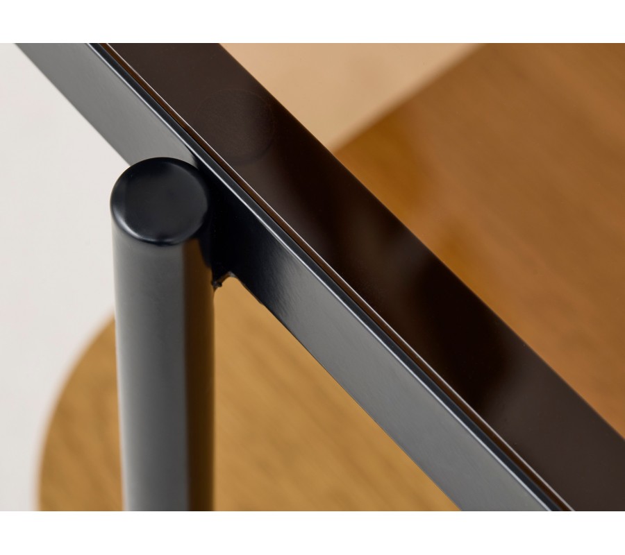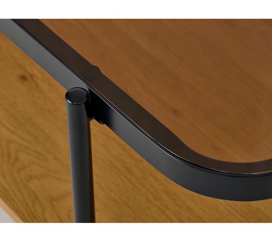 Zaoblené rohy zjemňujú inak lineárnu siluetu a dodávajú stolíku retro výraz. Vrchná doska je osadená v kovovom rám, ku ktorému sú na dlhších stranách upevnené štyri nožičky, držiace zároveň aj policu. Ich štíhly valcovitý tvar pôsobí v kombinácii so sklom odľahčene a vzdušne. Prevedenie v čiernej farbe zasa vytvára štýlový kontrastný prvok.