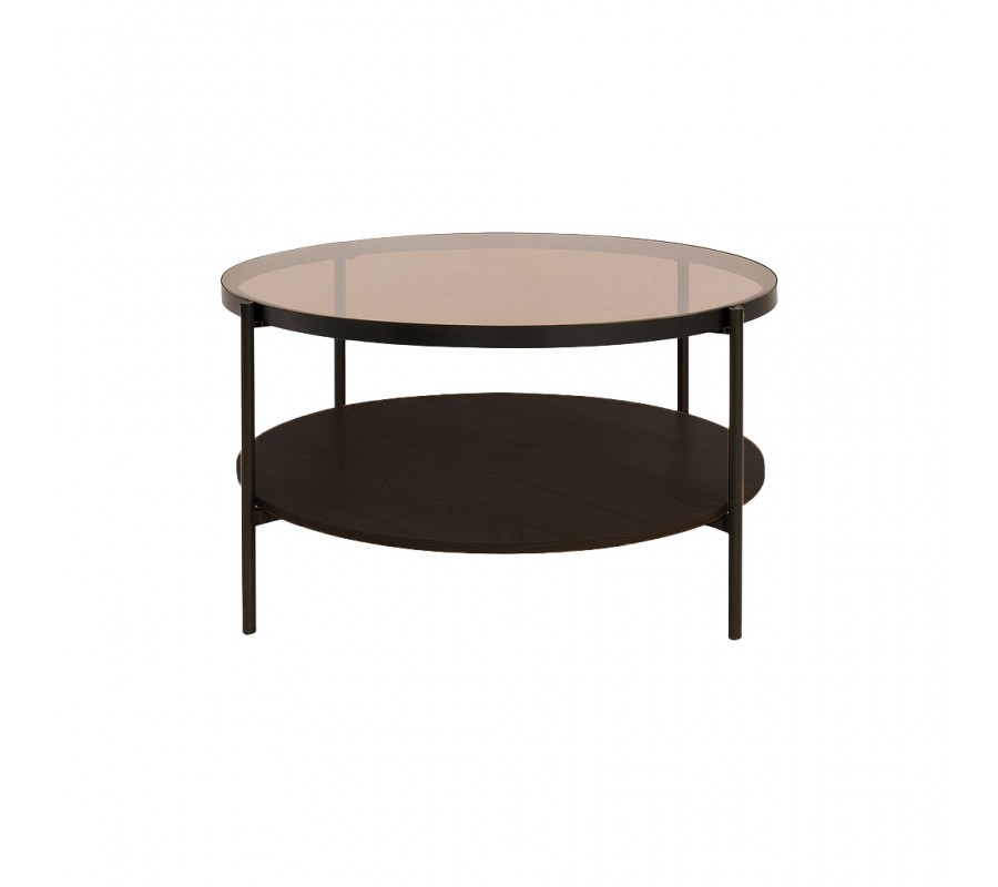 Stolík má okrúhlu vrchnú dosku z hnedého tónovaného temperovaného skla. Dopĺňa ju polica rovnakého tvaru z melamínovej dyhy v tmavom hnedom dubovom prevedení s pravidelnou kresbou letokruhov, ktorá dodáva stolíku teplý prírodný prvok. Bezpečnostné sklo poskytuje pevný, na údržbu nenáročný povrch a melamín je zasa mimoriadne odolný voči oteru, teplu a vlhkosti.