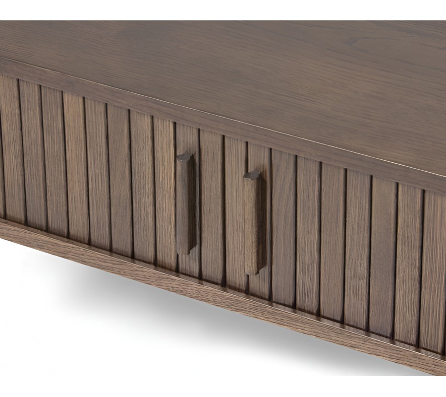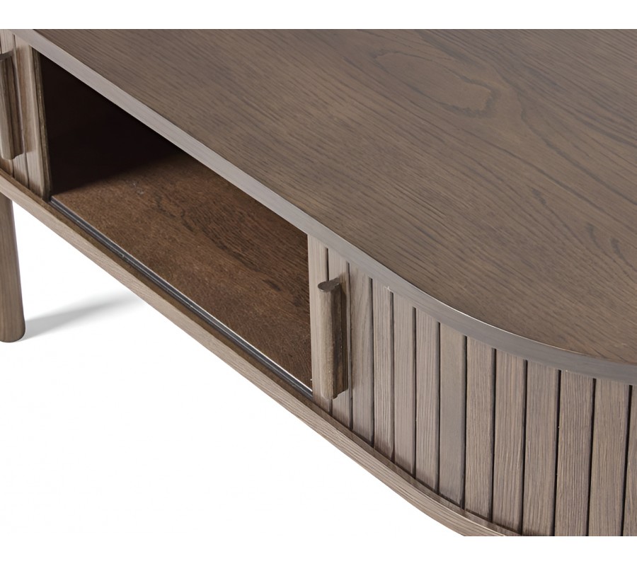 Pod doskou je umiestnený praktický uzatvárateľný úložný priestor rovnakého tvaru. Po obvode ho zdobia pravidelné vertikálne lamely a na dlhšej strane sa nachádzajú posuvné dvierka s valcovitými úchytkami, dodávajúce dizajnu výrazný retro charakter.