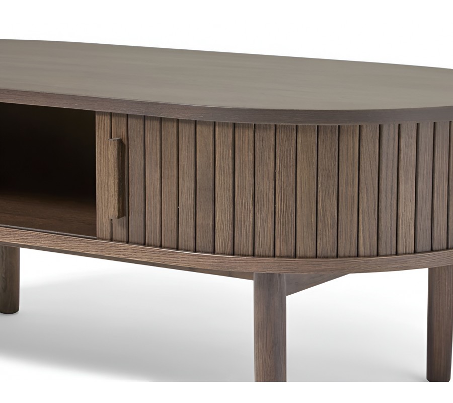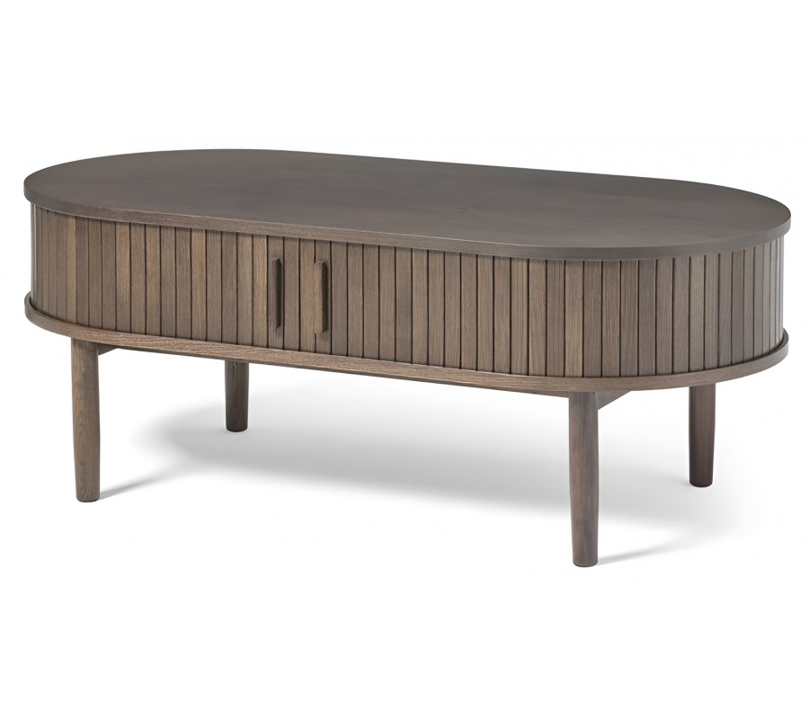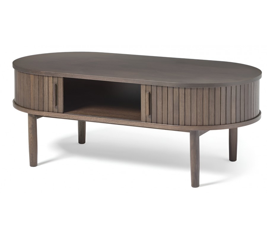 Retro oválny konferenčný stolík Alborg s úložným priestorom s dvoma posuvnými dvierkami v tmavom hnedom dubovom prevedení 120 cm