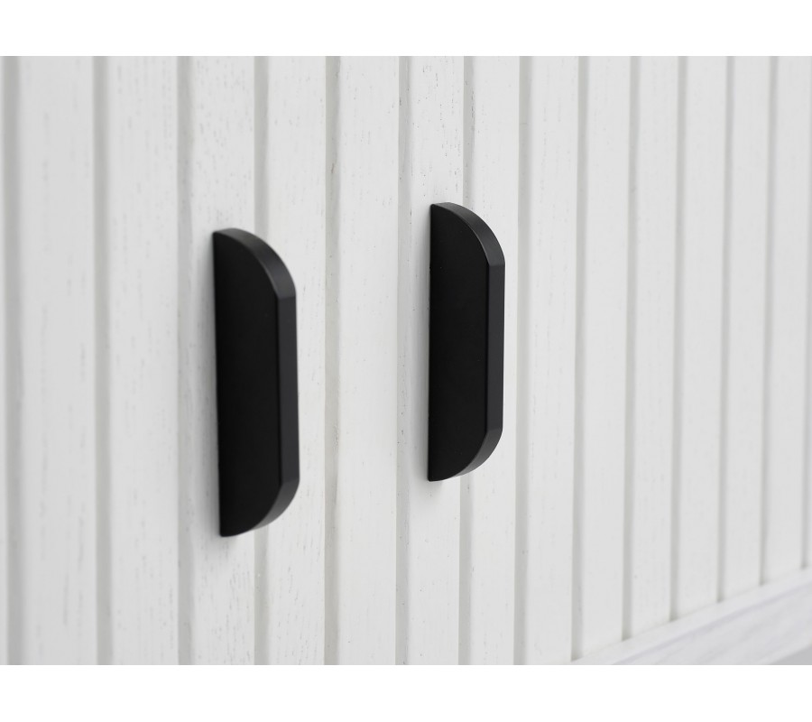 Stolík má štyri vyššie štíhle nožičky, vyrobené z matného čierneho kovu, vytvárajúceho kontrastný akcent. Sú stabilné a zároveň nábytok vizuálne odľahčujú. Úchytky dvierok v rovnakom prevedení majú úzky zvislý tvar a výborne korešpondujú s lamelovým zdobením.