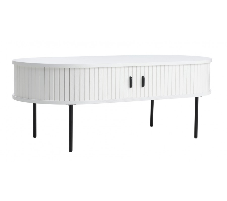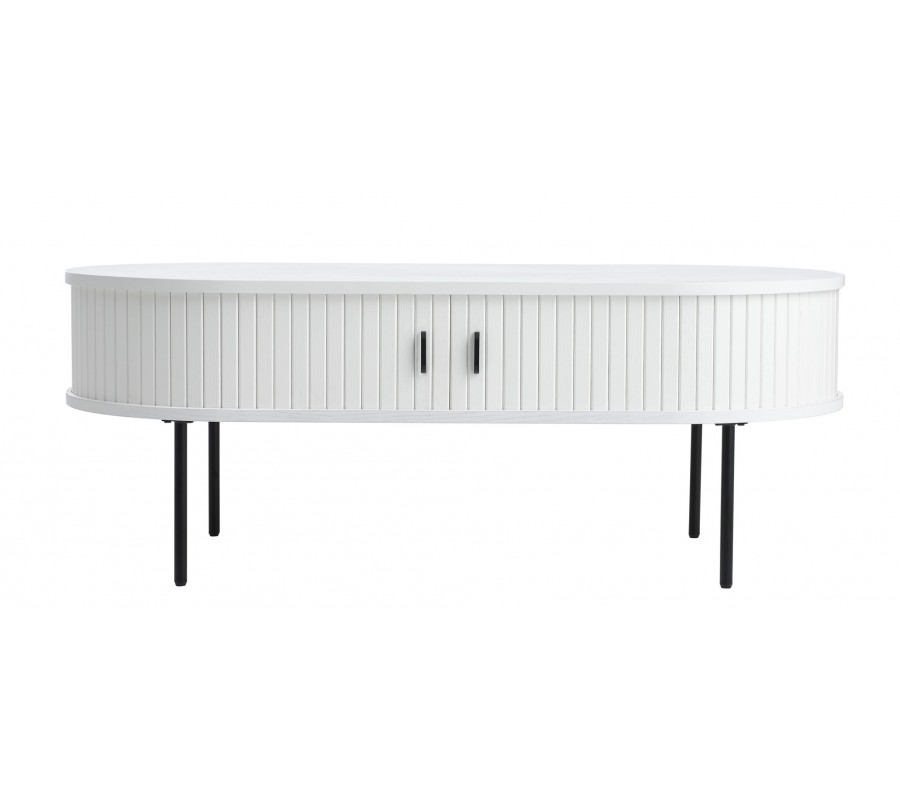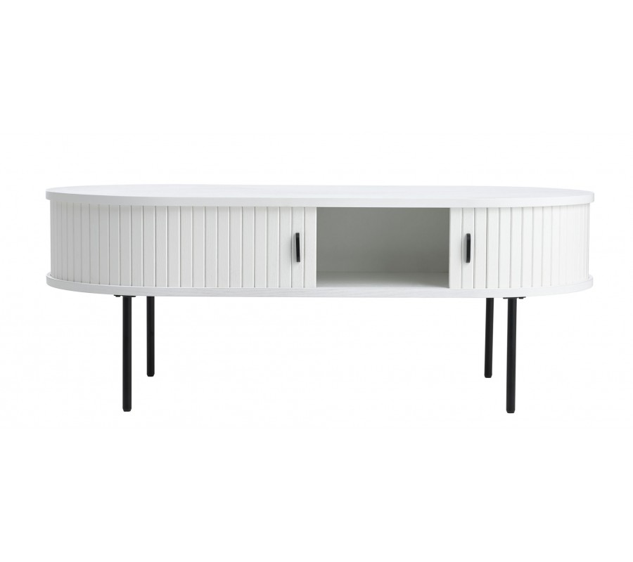 Moderný oválny konferenčný stolík Bornholm s úložným priestorom s posuvnými dvierkami v bielej farbe s čiernymi detailmi 120 cm