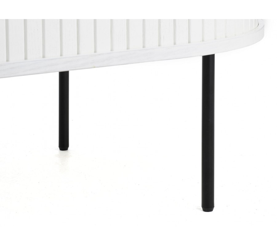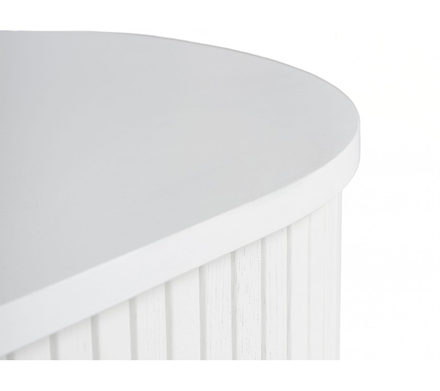 Vrchná časť stolíka je vyrobená z kombinácie dubovej dyhy a MDF. Vrchná doska má hladký oválny tvar a pod ňou sa nachádza nižší úložný priestor, uzatvárateľný dvomi posuvnými dvierkami. Obvod zdobí vertikálny lamelový reliéf, ktorý pôsobí dekoratívne a zároveň minimalisticky. Prevedenie v čistej bielej farbe dodáva nábytku eleganciu.