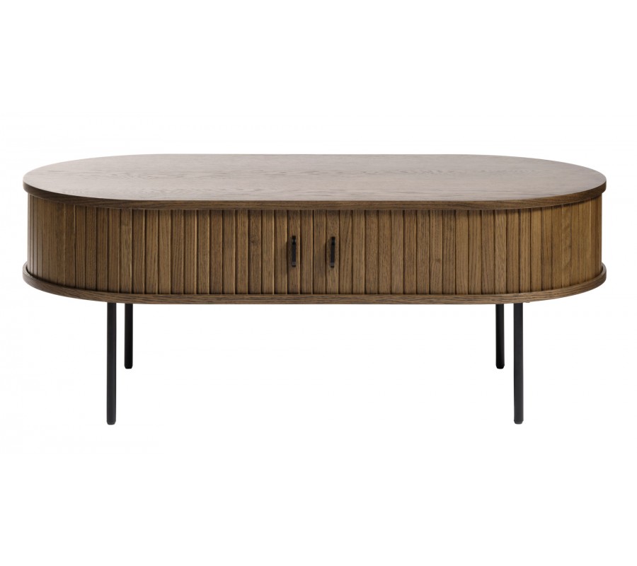 Vrchná doska má oválny tvar a na jej hladkom povrchu sa odvíja pravidelná kresba dubového dreva. Pod ňou je umiestnený nižší úložný priestor, ktorého obvod zdobia vertikálne lamely. Nenápadne integrované posuvné dvojité dvierka sú inšpirované retro nábytkom.