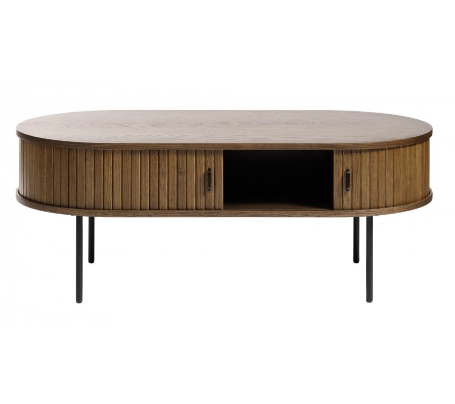 Škandinávsky retro oválny konferenčný stolík Bornholm s úložným priestorom s lamelovým dekorom s tmavom hnedom prevedení 120 cm