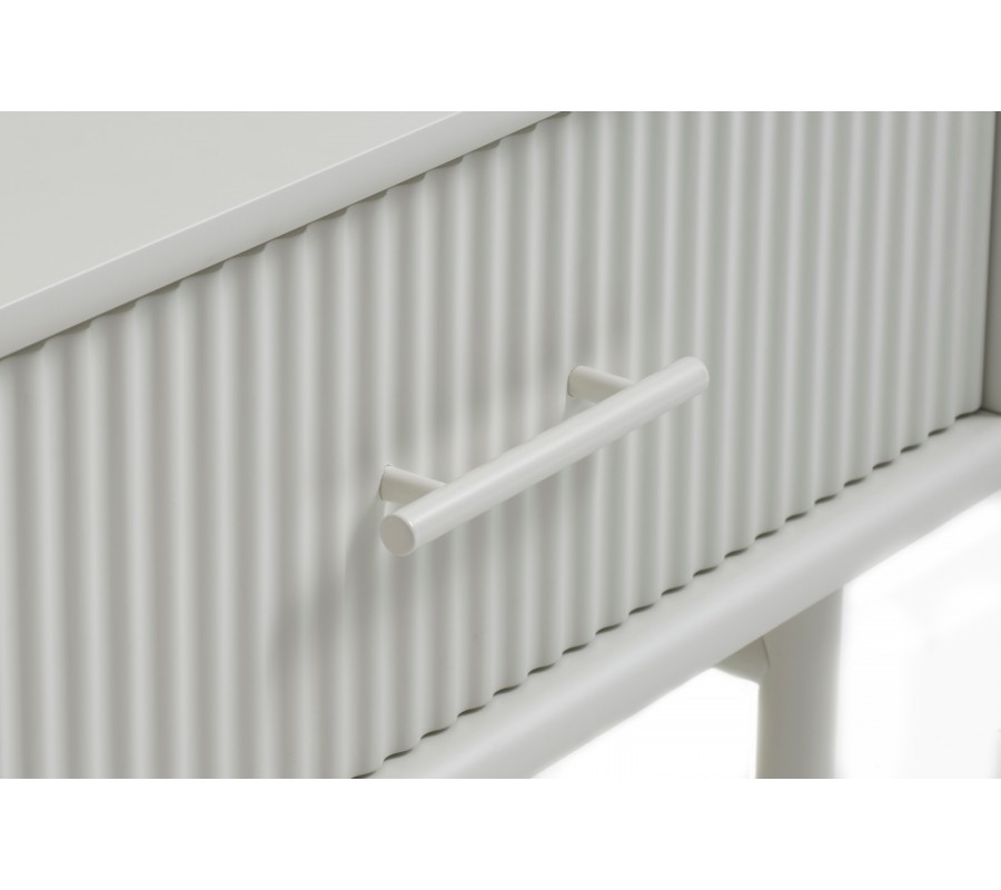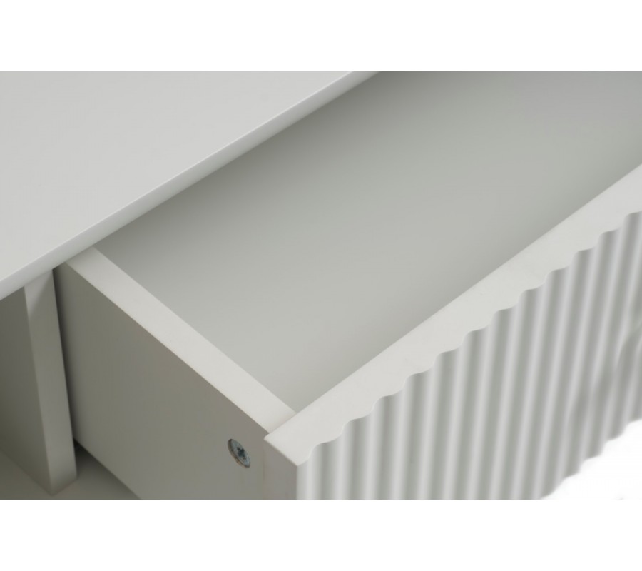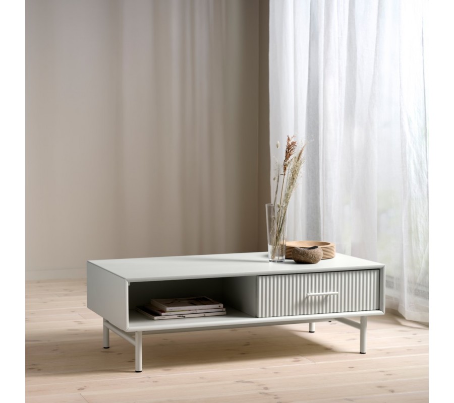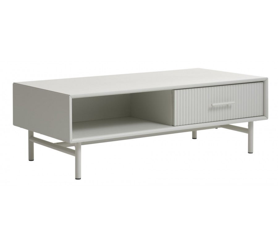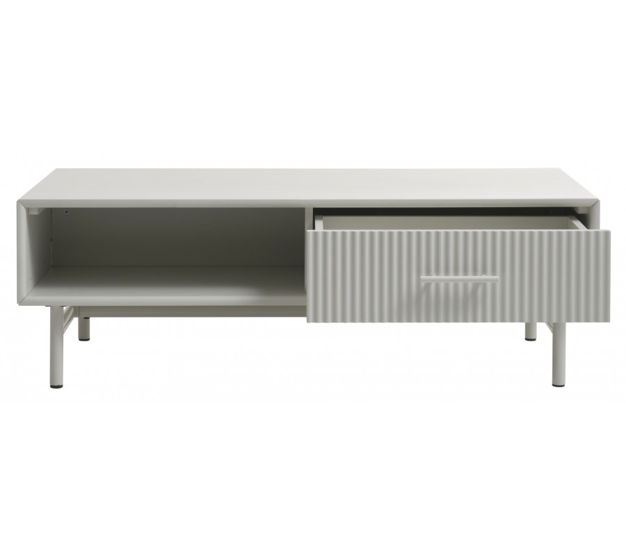 Moderný obdĺžnikový konferenčný stolík Hvidea s policou a zásuvkou s rebrovaným dekorom so svetlom béžovo sivom odtieni 120 cm
