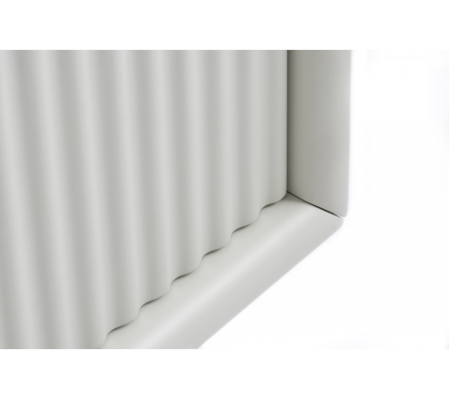 Stolík má hladkú obdĺžnikovú vrchnú dosku, pod ktorou sa nachádza nižší úložný priestor. Je predelený na dve polovice. Jednu vypĺňa zásuvka s fasádou s rebrovaným reliéfom a druhú polica s otvorenou prednou stenou. Zásuvku dopĺňa valcovitá úchytka, ktorá svojím tvarom korešponduje so štyrmi nohami. Pre lepšiu stabilitu sú prepojené výstuhou v tvare H. Úložný priestor na stranách výrazne presahuje rámovanie podstavy a vytvára tak elegantnú siluetu, inšpirovanú art deco štýlom.