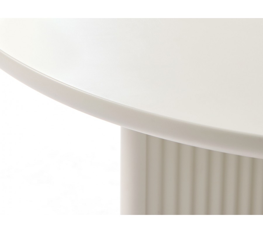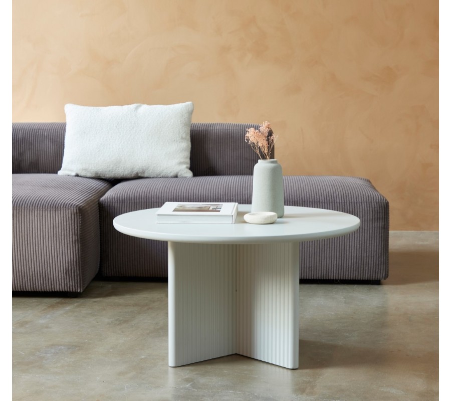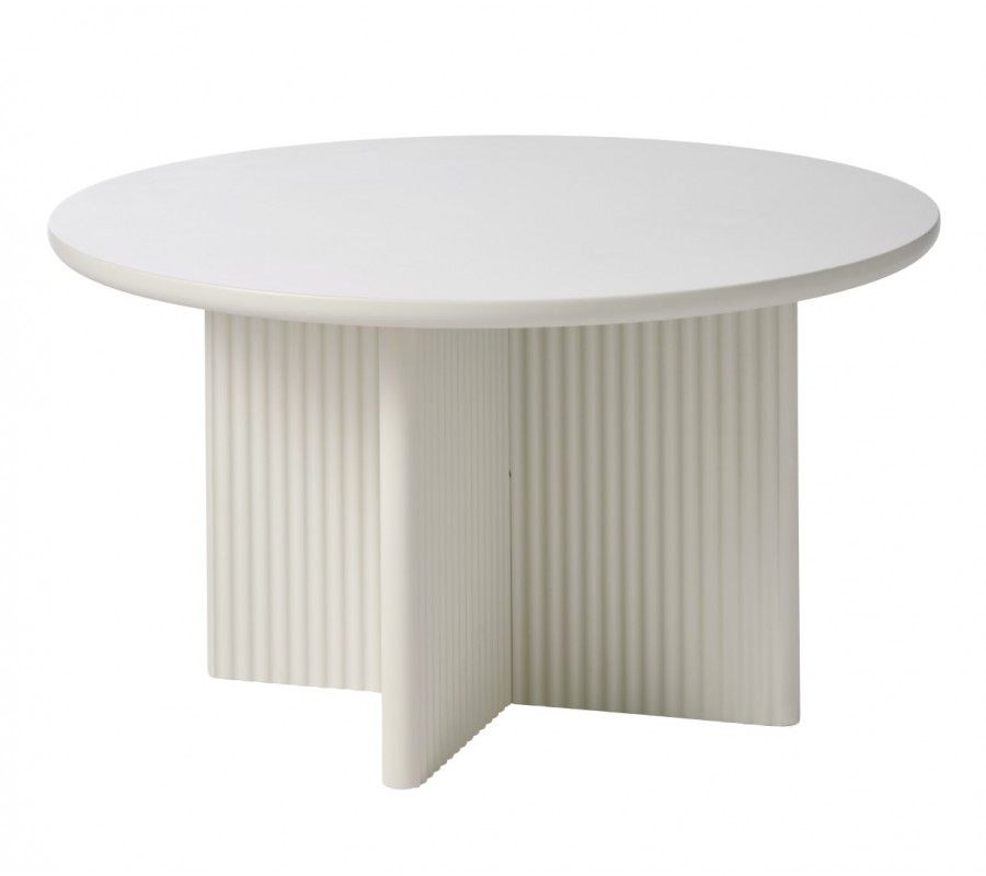 Moderný okrúhly konferenčný stolík Hvidea s podstavou v tvare kríža s rebrovaným dekorom vo svetlej sivo béžovej farbe 80 cm