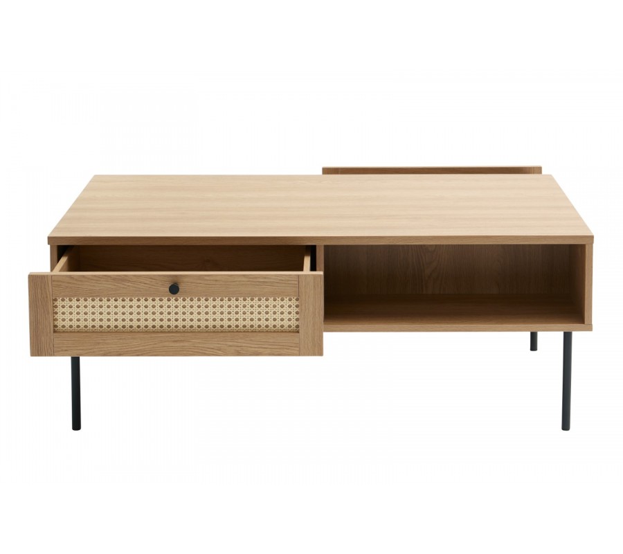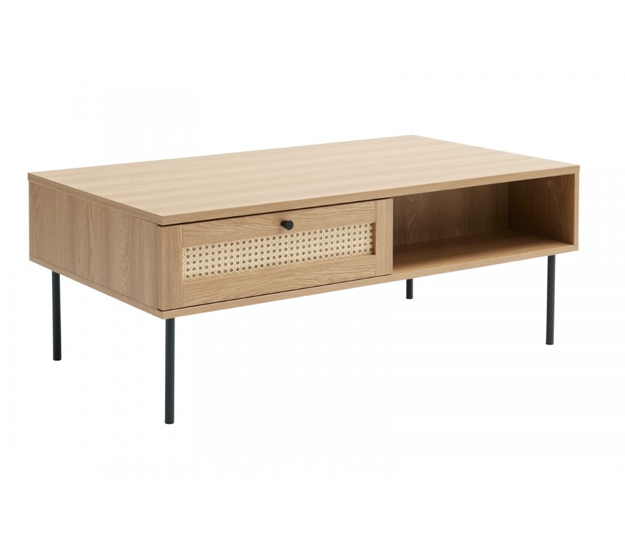 Moderný obdĺžnikový konferenčný stolík Malmo s dvomi policami a zásuvkami s ratanovým výpletom v svetlej hnedej farbe 110 cm