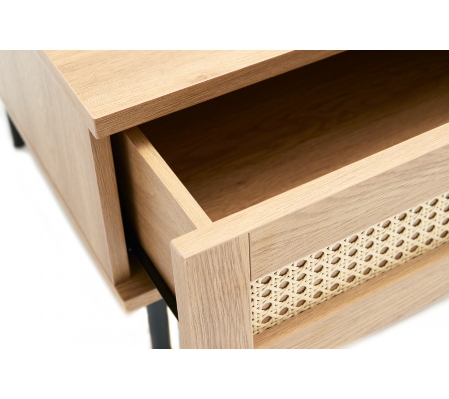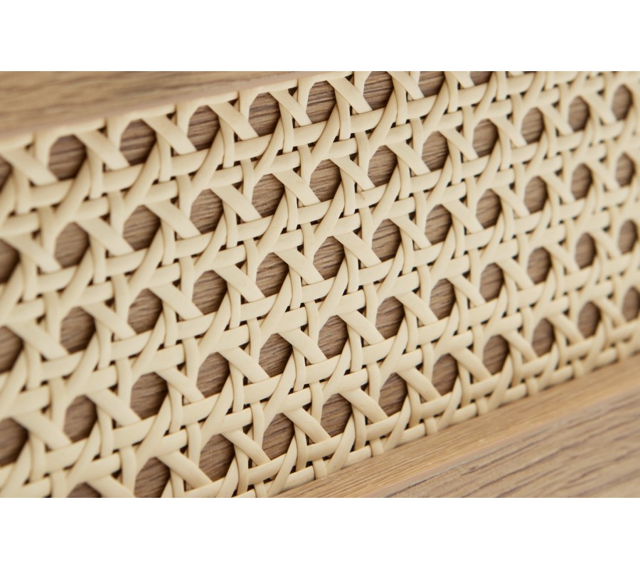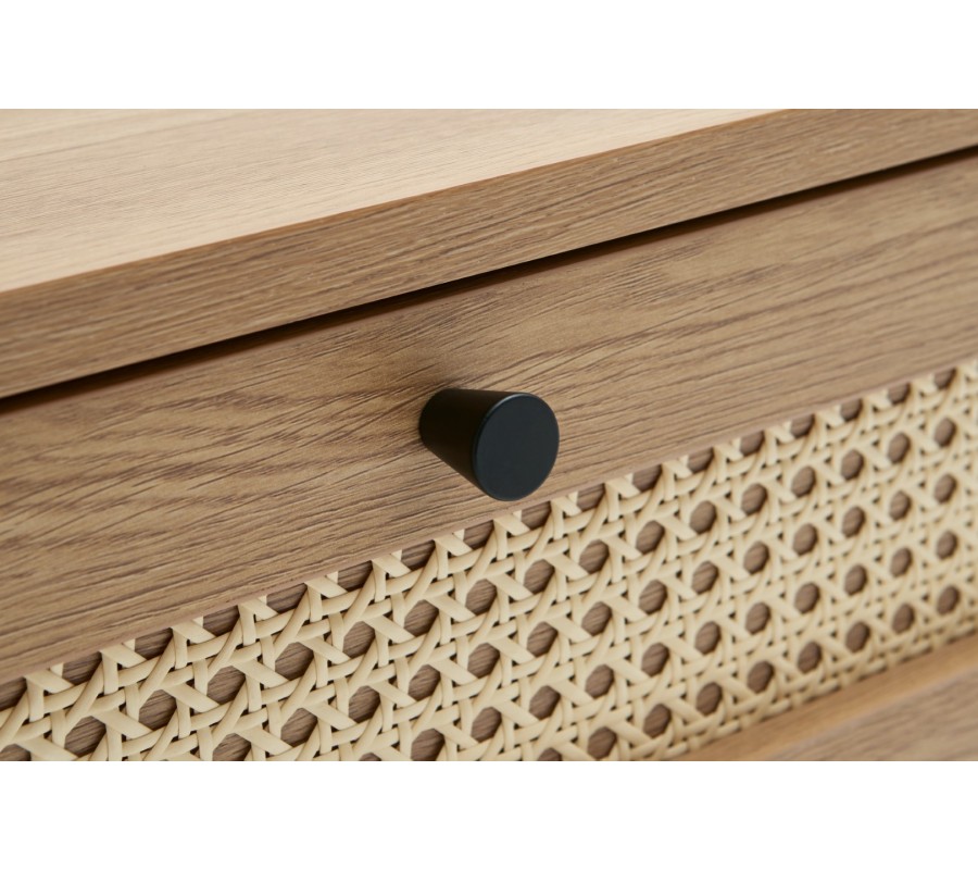 Zaujímavým dekoračným detailom sú čelá zásuviek s ratanovým výpletom. Béžová farba krásne ladí s hrejivým vizuálom dreva a viedenský vzor prináša do dizajnu retro akcent. Úchytky majú minimalistický okrúhly tvar a svojím čiernym kovovým prevedením sa vizuále prepájajú so štyrmi štíhlymi valcovitými nohami.
