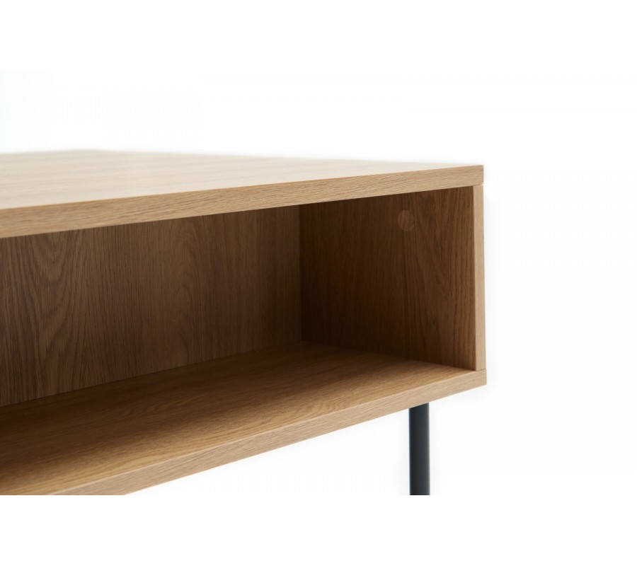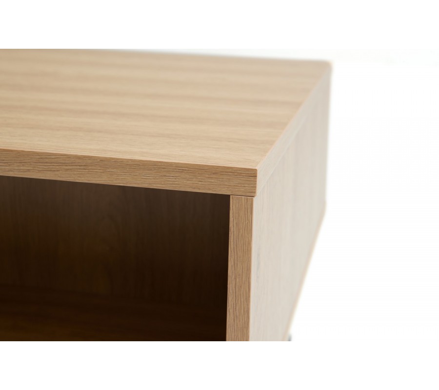 Stolík je vyrobený z kvalitnej MDF dyhy s melamínovou povrchovou úpravou, zaručujúcou vysokú odolnosť aj pri intenzívnom každodennom používaní. Prevedenie vo svetlom hnedom dubovom dekore mu dodáva typický škandinávsky výraz.
