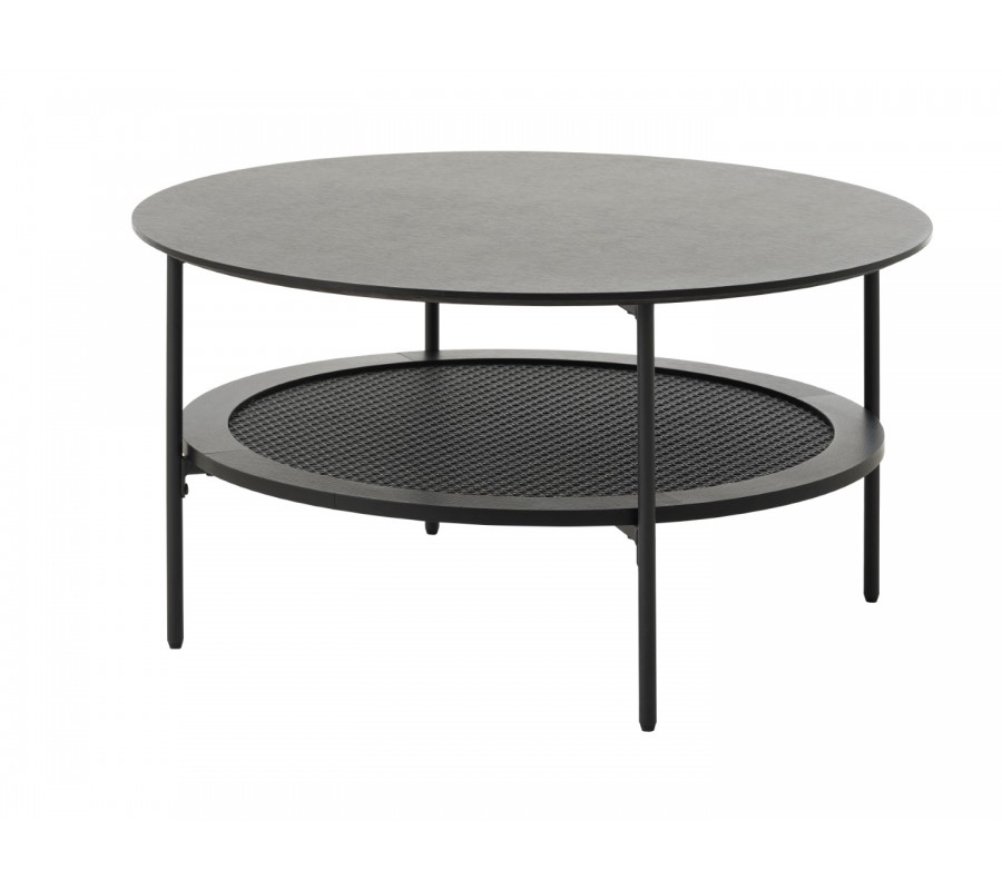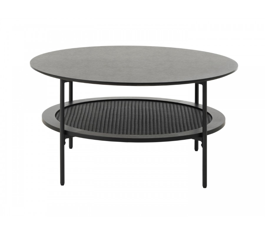 Industriálny moderný čierny konferenčný stolík Malmo s okrúhlou vrchnou doskou a policou s viedenským ratanovým výpletom 80 cm
