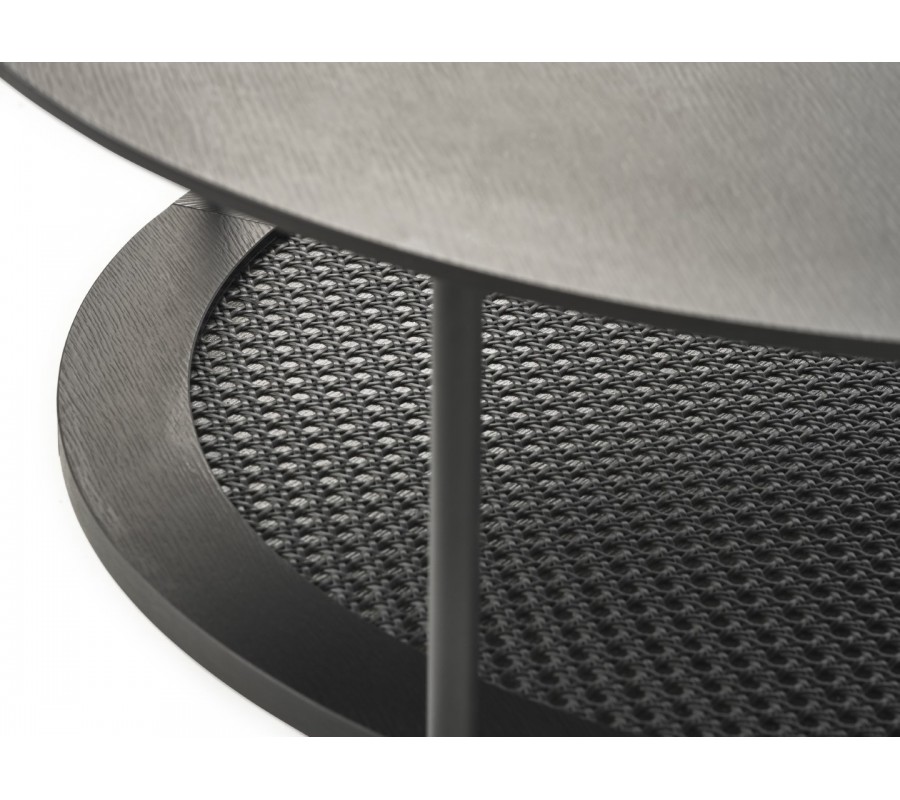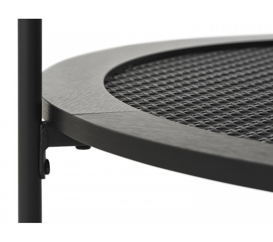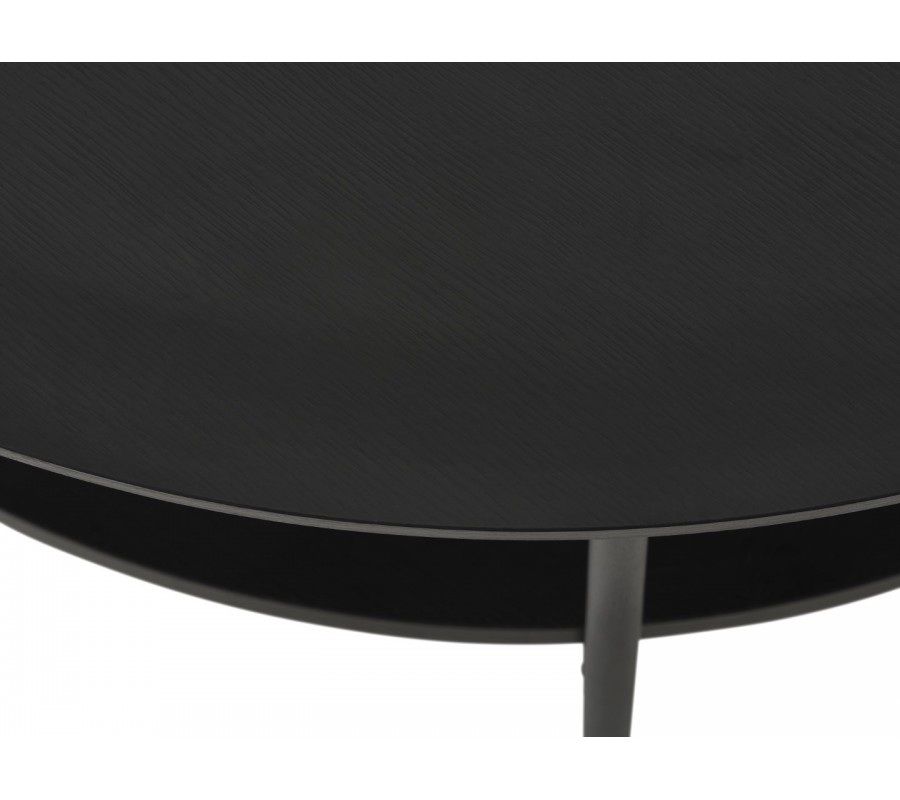 Stolík má hladkú okrúhlu vrchnú dosku, vyrobenú z kvalitnej MDF dyhy s melamínovou povrchovou úpravou, zaručujúcou výbornú odolnosť voči teplu, vlhku a mechanickému poškodeniu. Čierne prevedenie dopĺňa jemná štruktúra letokruhov dreva, ktorá vytvára subtílny prírodný akcent.