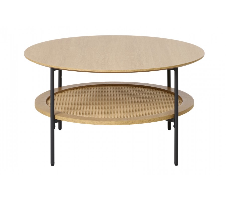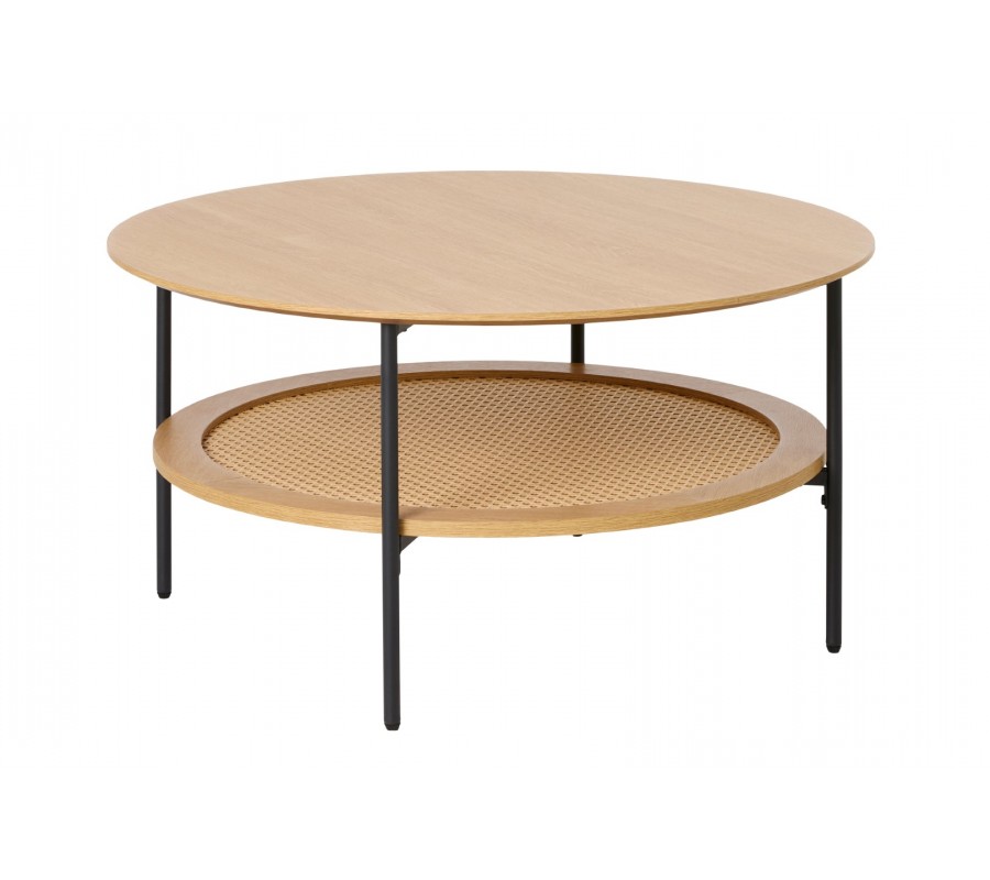 Škandinávsky okrúhly konferenčný stolík Malmo v hnedom dubovom dekore s policou s ratanovým výpletom a čiernymi nohami 80 cm