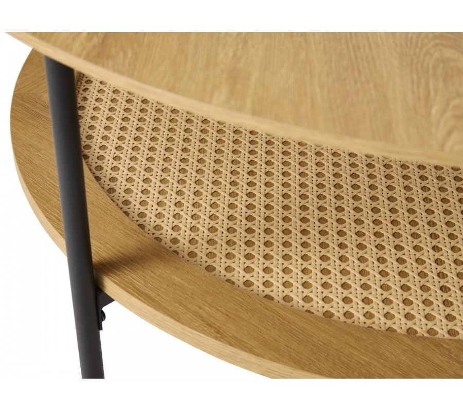 Pod doskou sa nachádza praktická polica s dreveným rámom v rovnakom dekore, ktorú dopĺňa béžový ratanový výplet. Jeho viedenský vzor pôsobí elegantne a dodáva stolíku jemný dekoratívny akcent s retro nádychom. Stabilitu zabezpečujú štyri štíhle nožičky z čierneho kovu, ktoré svojím jednoduchým tvarom odľahčujú celkový vzhľad a zároveň vytvárajú decentný kontrast k svetlému drevu.