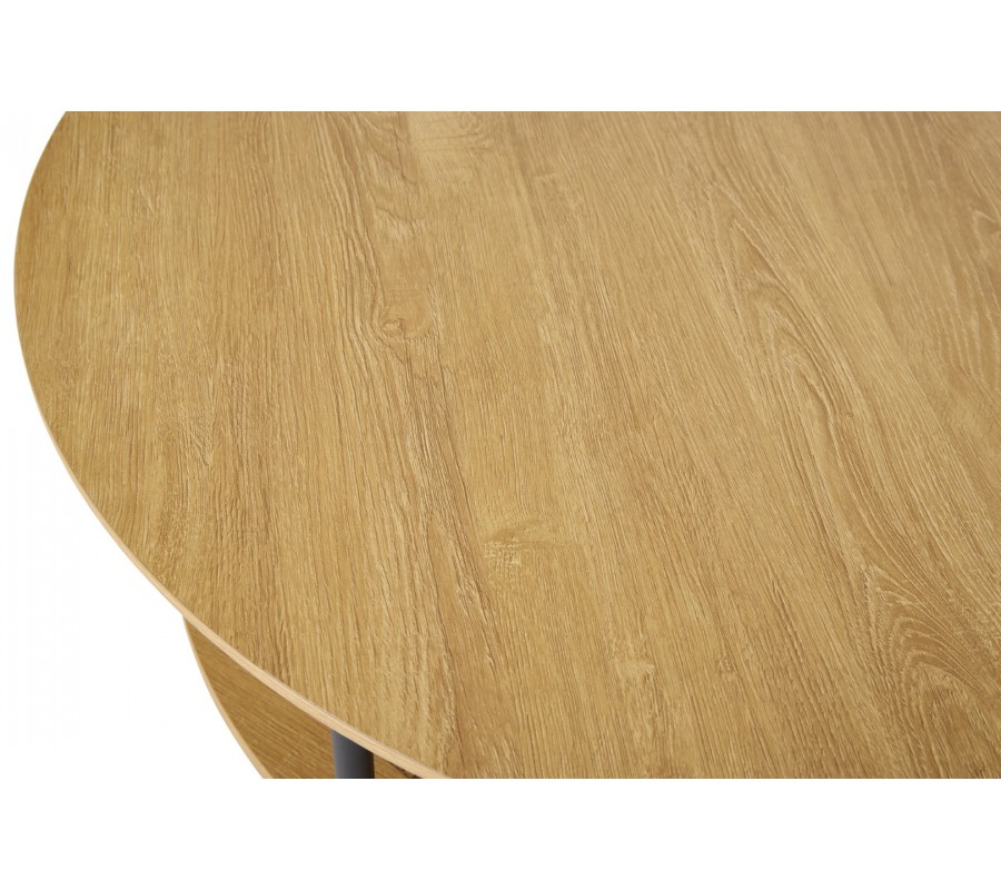 Vrchnú časť tvorí okrúhla doska s hladkým povrchom, vyrobená z kvalitnej MDF s odolnou melamínovou úpravou. Tá zabezpečuje dlhú životnosť a odolnosť voči teplu, vlhkosti aj bežnému opotrebovaniu. Svetlý hnedý dubový dekor s prirodzenou kresbou dreva prináša do interiéru typický škandinávsky vizuál.