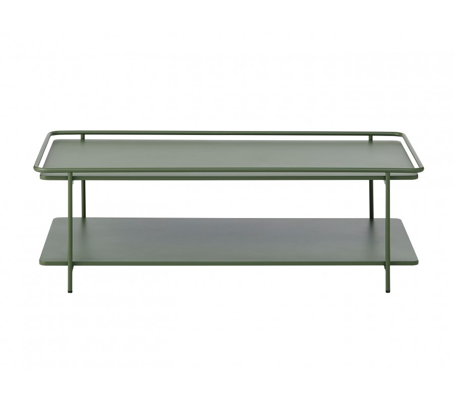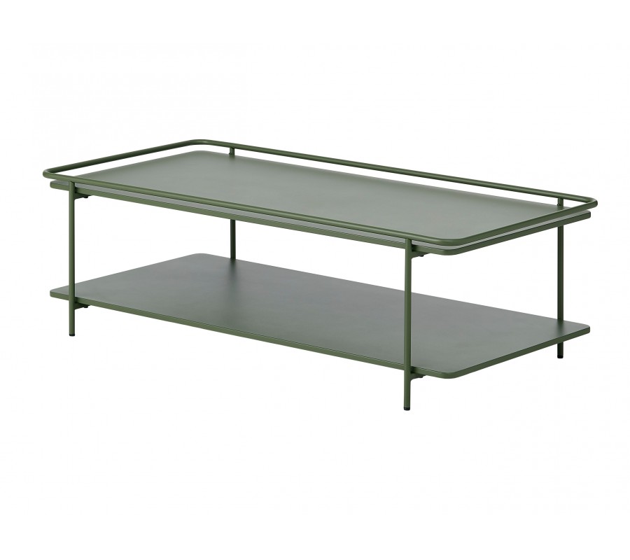 Moderný konferenčný stolík Koge s obdĺžnikovou vrchnou doskou a policou z kovu v olivovej zelenej farbe 110 cm