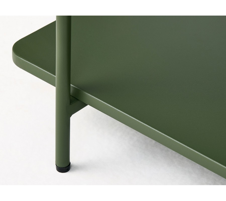 Stolík je vyrobený z pevného kovu, ktorý je odolný a nenáročný na údržbu. Povrch je matný, v elegantnom olivovom zelenom prevedení.