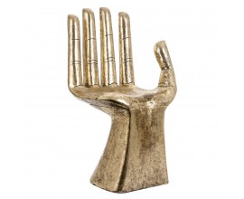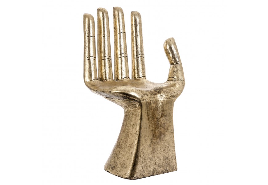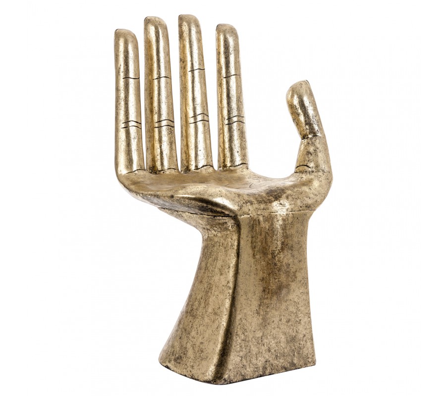 Dizajnové atypické kreslo v tvare ruky je ručne vyrobené z mangového dreva. Kreslo je v tvare ľudskej dlane, kde prsty ruky spolu s palcom predstavujú štýlovú opierku a dlaň slúži ako sedacia časť. Kreslo v tvare ruky je sfarbené do starej zlatej farby, čo mu pridáva na autentickosti a zvýrazňuje jeho vintage ráz. Vhodné je do interiérov zariadených v art-deco štýle prípadne v shabby-chic štýle. V neposlednom rade hlavne ide o dizajnové kreslo, ktoré by nemalo byť skryté len tak v obývacej izbe, ale odporúčané je ním vybaviť viac ľuďom exponované priestory ako napríklad rôzne prezentačné miestnosti firiem, hotelov či reštaurácii.