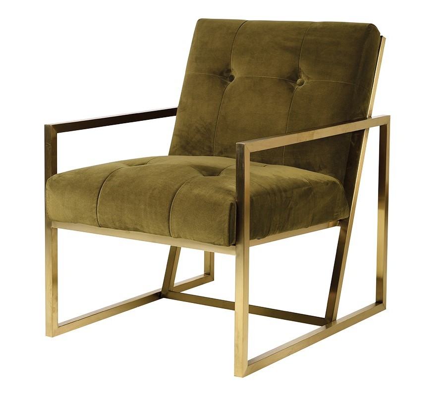Jedinečné art-deco kreslo v olivovej farbe so zlatou opornou konštrukciou je dokonalým spojením nadčasového retro štýlu s modernými líniami. Kreslo je vyrobené z materiálu, ktorý pripomína zamat, materiál je prešitý a doplnený elegantnými gombíkmi. Kreslo vďaka svojej výške nožičiek poskytuje jednoduchý prístup k upratovaniu. Kreslo je vhodné najmä do retro či art-deco zariadených interiérov, no zaručene oživí akúkoľvek obývaciu izbu či pracovňu.