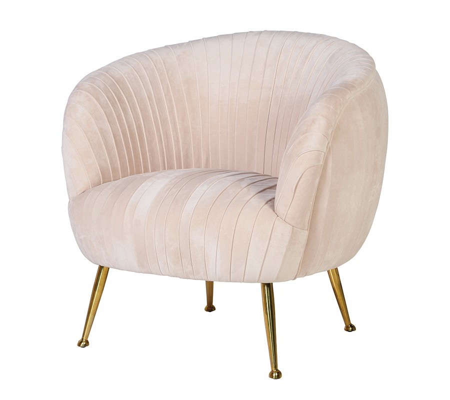Predstavujeme vám jedinečné kreslo z kolekcie art-deco nábytku Viviane, ktoré zaručene rozžiari a zútulní váš interiér! Plisovaný poťah svetlučko ružovo-smotanovej farby pôsobí jemne a decentne a v kombinácii so zlatými nohami tvorí exkluzívny kúsok, ktorý zaujme najmä prívržencov luxusného art-deco štýlu. Kreslo má zaoblený tvar a je prispôsobené k vášmu dokonalému pohodliu. Mäkká, komfortná sedacia časť aj operadlo vám zaručia príjemné chvíle oddychu pri knihe či večeri s rodinou či priateľmi. Kreslo Viviane skvelo vynikne v moderne zariadených svetlejších interiéroch a dá sa krásne kombinovať s farbami ako zlatá, biela, staroružová či svetlomodrá. Taktiež odporúčame kombinovať s ďalšími produktami z našej kolekcie Viviane.