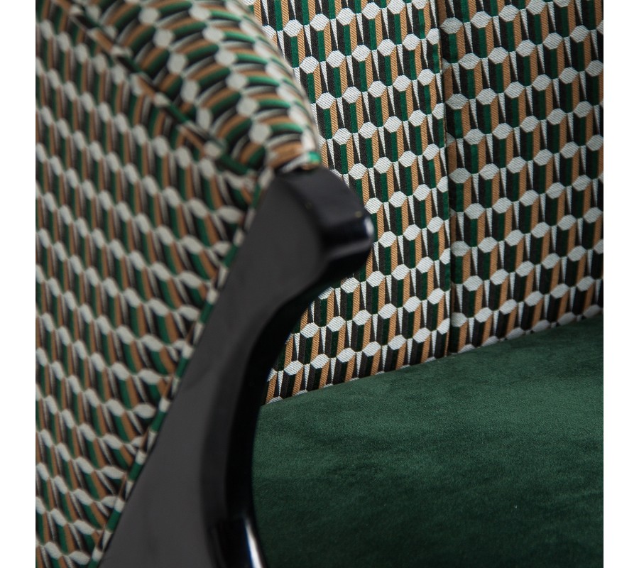 Z našej kolekcie Ampelio II vám prinášame toto jedinečné kreslo, ktoré vás zaručene zaujme svojím nevšedným dizajnom. Nadčasová zelená farba príjemne oživí váš interiér a geometrické vzory na operadle činia kreslo ešte originálnejším a štýlovejším. Vďaka príjemnému zamatu si s kreslom Ampelio II môžete dopriať ozajstný komfort a ničím nerušené chvíle oddychu. Čierne nohy tvoria s farebnosťou poťahu decentný súlad, ktorý možno obohatiť rôznymi doplnkami či už v čiernej, zelenej, alebo inej výraznejšej farbe.