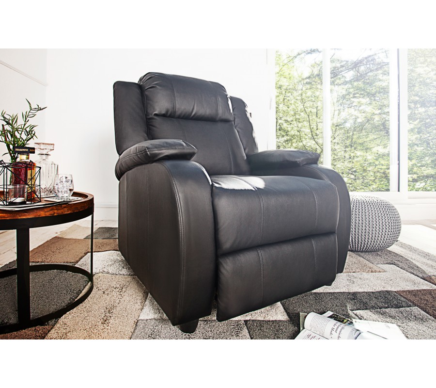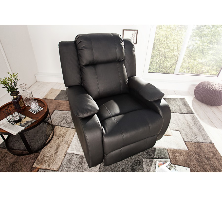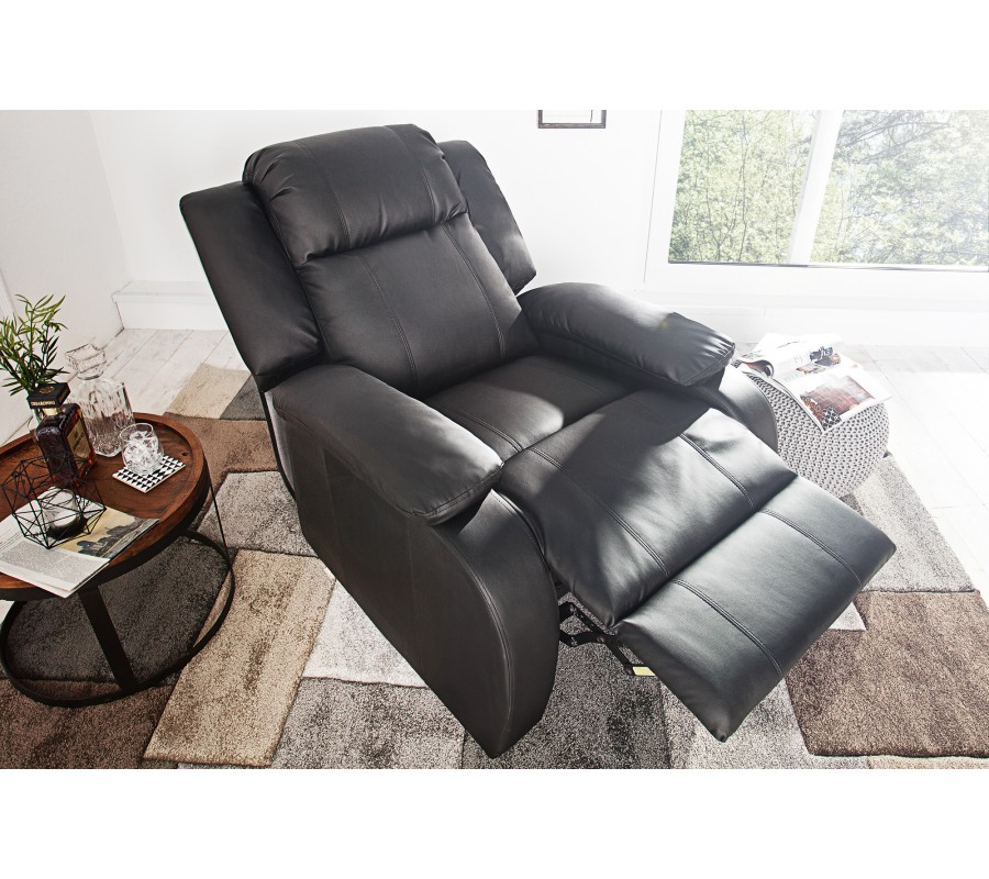 Štýlové nastaviteľné kreslo v imitácii kože čierne farby je ideálnou voľbou ako relaxačný prvok do moderne či retro zariadených domácností. Čalúnenie je vyhotovené z polyuretánu. Rozmery: 90cm x 77-106cm x 90-160cm, sedák: 54cm x 50cm x 54cm.