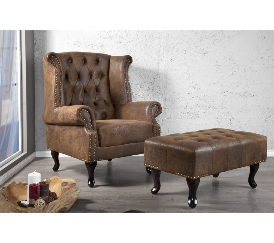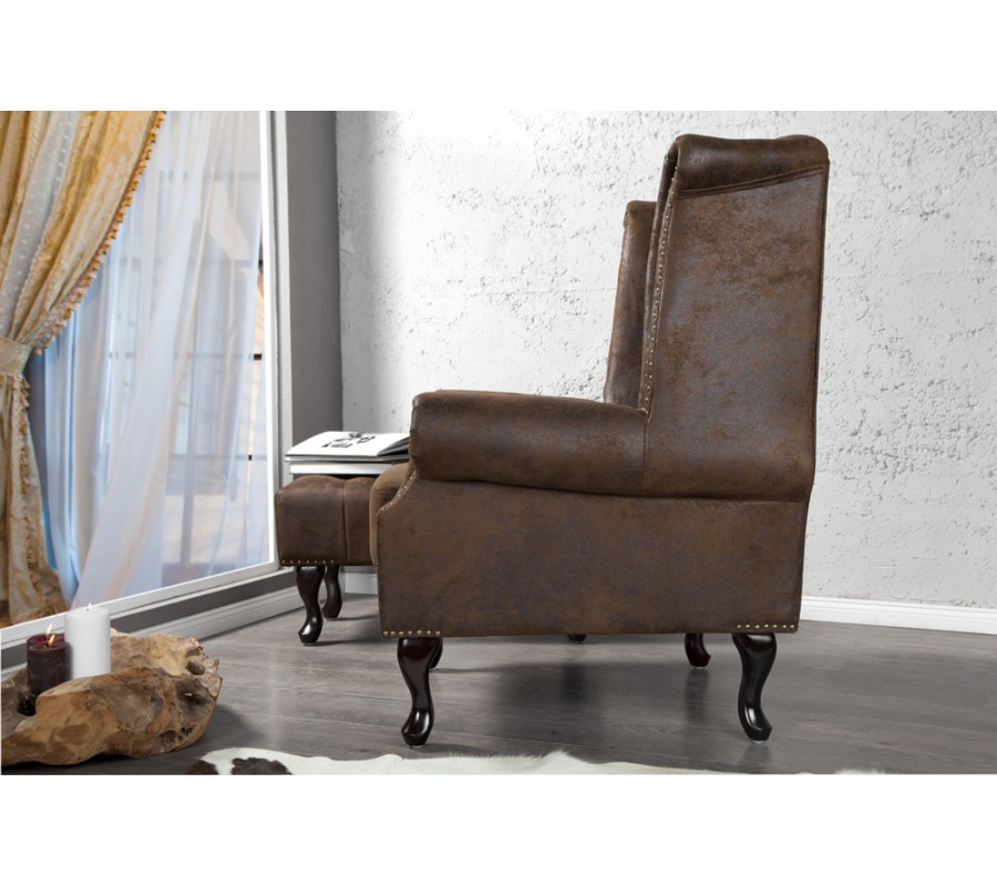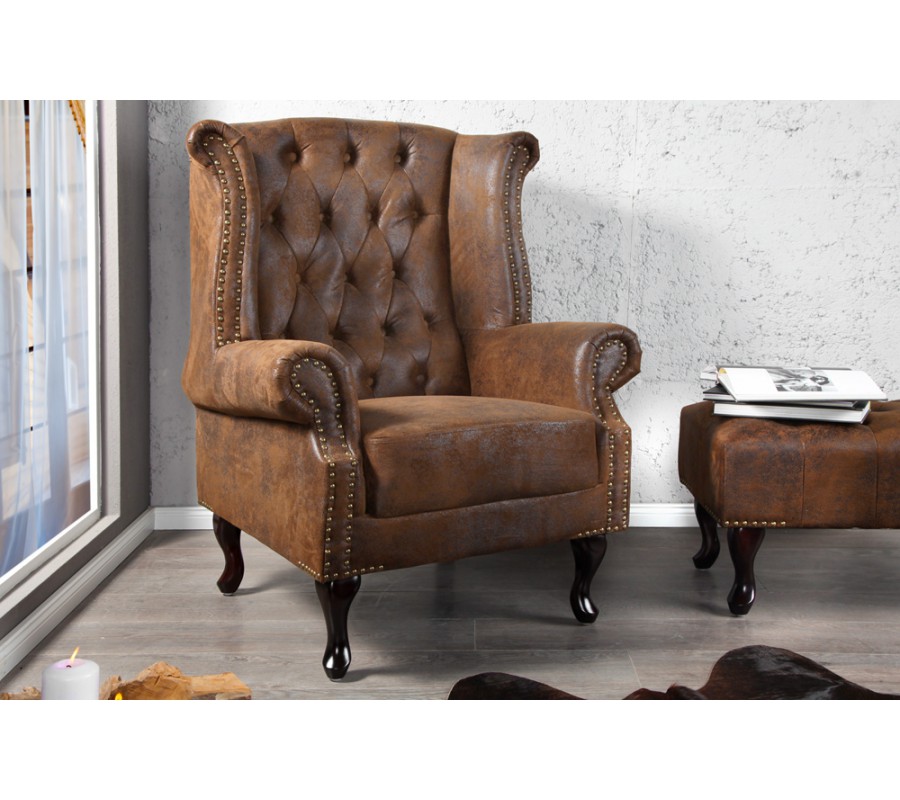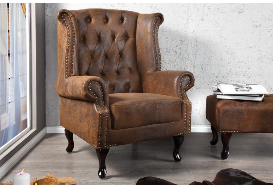 ►Kreslá ►Dizajnové a luxusné kreslá do pracovne a kancelárie ►Chesterfield sedačky ►Kolekcia Chesterfield sedačiek a kresiel ANTIK ►Ušiak ►S nožičkami ►Čalúnený - Koža ►Čalúnený - Poťahová látka ►Hnedá ►S opierkami ►Kreslá ušiak ►Kožené kreslá