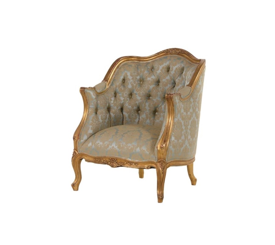 Luxusné honosné kreslo Roi Gilt výstižne reprezentuje barokový nábytok zámockého štýlu. Hodvábny poťah je starozelenej farby, doplnený z prednej strany o prešívanie Chesterfield. Kreslo je vyrobené z mahagónového dreva, ktoré je obohatené o ručné vyrezávanie s kvetovým motívom, ktoré dominuje najmä v spodnej časti a na nožičkách. Kvetový motív je vyjadrený aj vo výraznom poťahu, ktoré si môžete všimnúť ako z prednej, tak zo zadnej časti. Kreslo vkusne zvýrazní barokový, alebo zámocký štýl vášho priestoru, v ktorom prinesie honosný dojem luxusu a okázalosti. Odporúčame kombinovať s luxusnou trojsedačkou Roi Gilt. Celú kolekciu Roi Gilt si pozriete tu.
